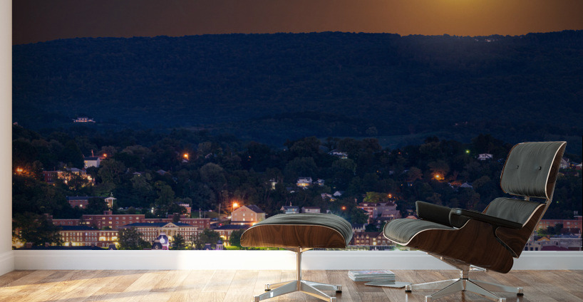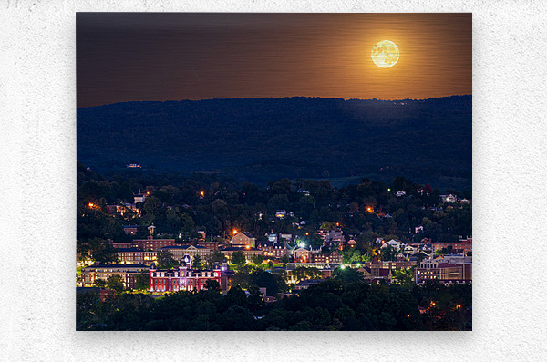 Cityscape of the city of Morgantown in WV as supermoon rises over the town and West Virginia downtown university campus