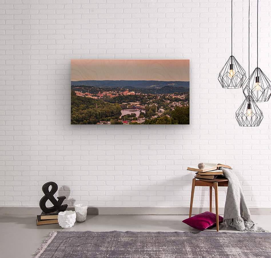 Sunset lights the sky above Morgantown in West Virginia Wood print