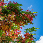 Crimson and yellow blossoms of the Rainbow Shower tree back lit by the sun against a blue sky on Kauai
