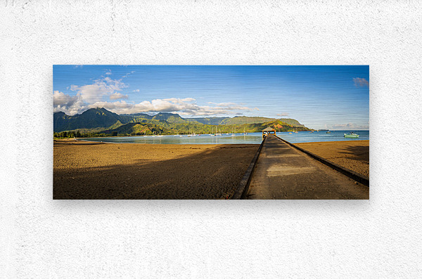 Get this artwork "Panorama of the sandy beach and Hanalei Pier at sunrise" in a framed print.