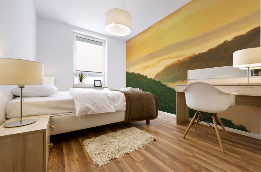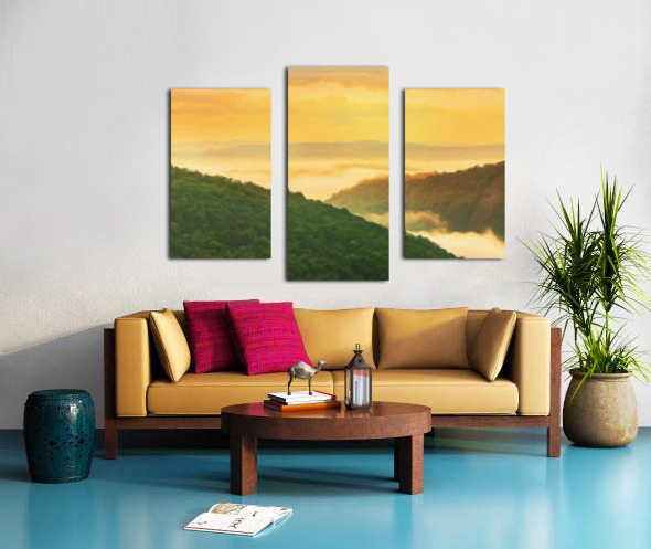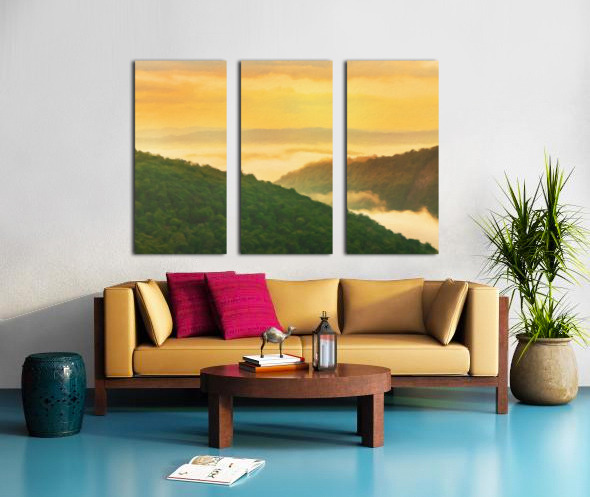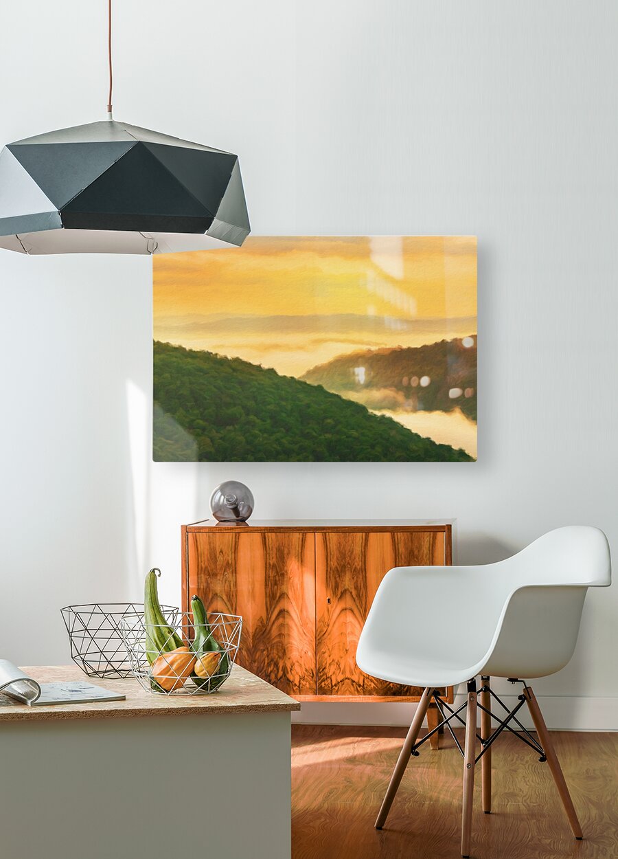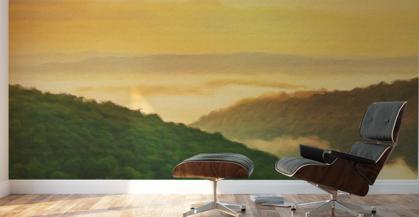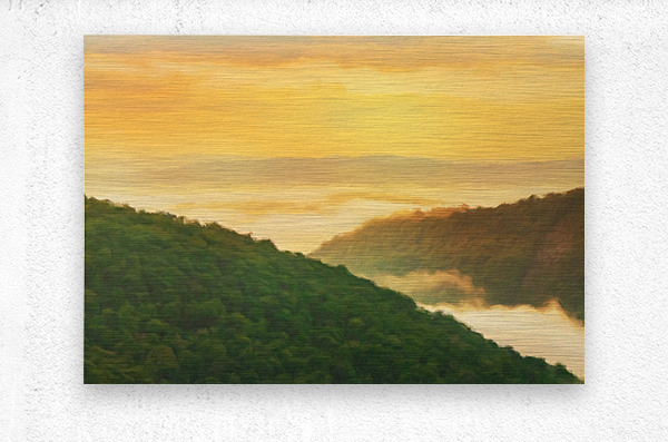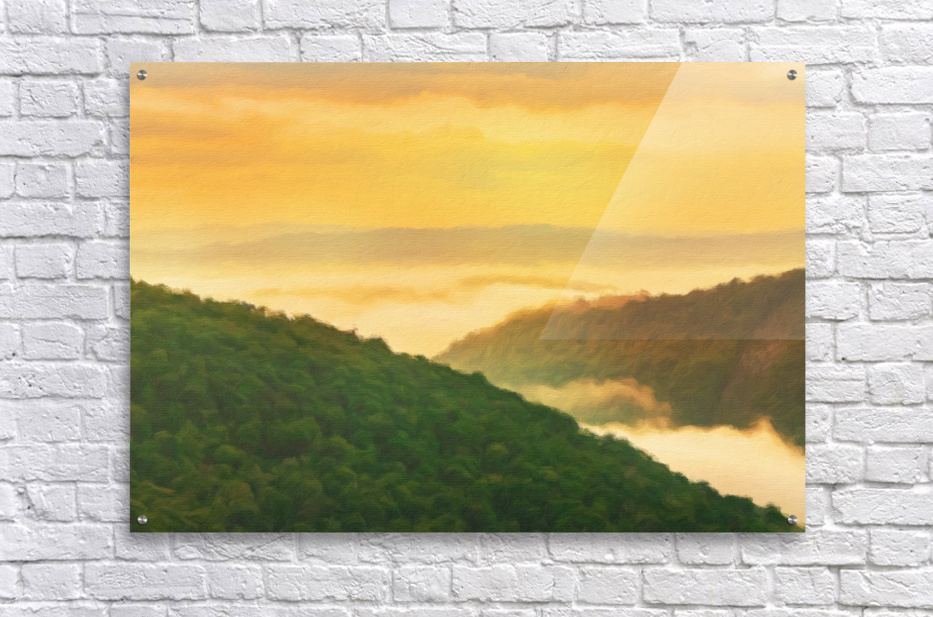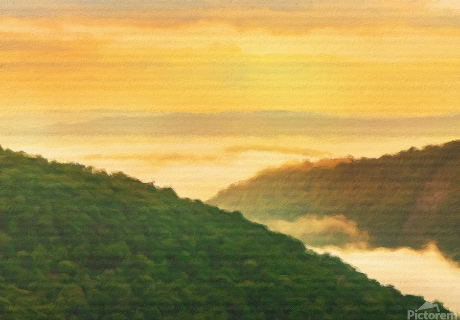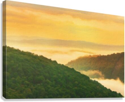 Digital impressionistic painting of early morning sunrise view of the mist swirling over the Cheat river in the notch of the canyon by Raven Rock. Seen from Coopers Rock State Park in West Virginia.