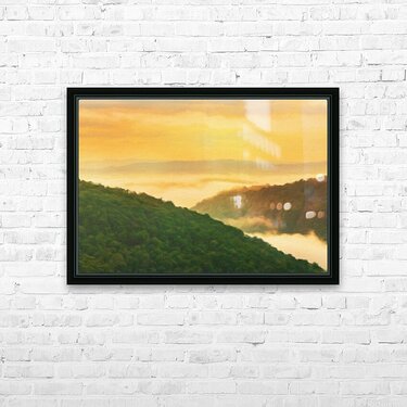 Digital impressionistic painting of early morning sunrise view of the mist swirling over the Cheat river in the notch of the canyon by Raven Rock. See...[+]