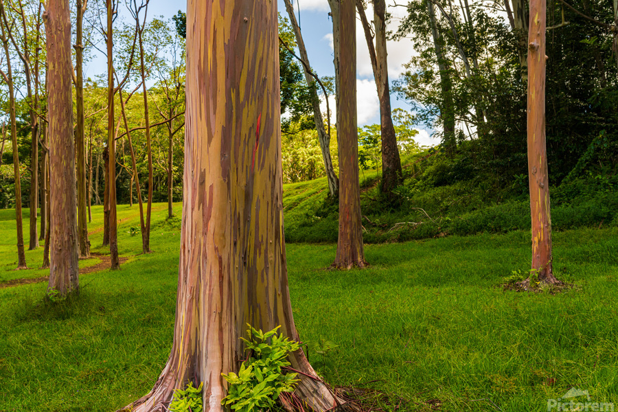 ABOUT THIS ARTWORK: GROUP OF RAINBOW EUCALYPTUS TREES IN KEAHUA ARBORETUM