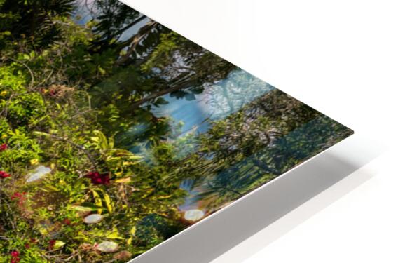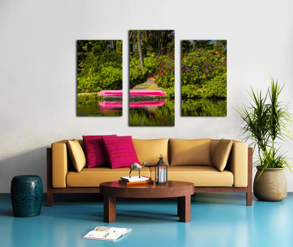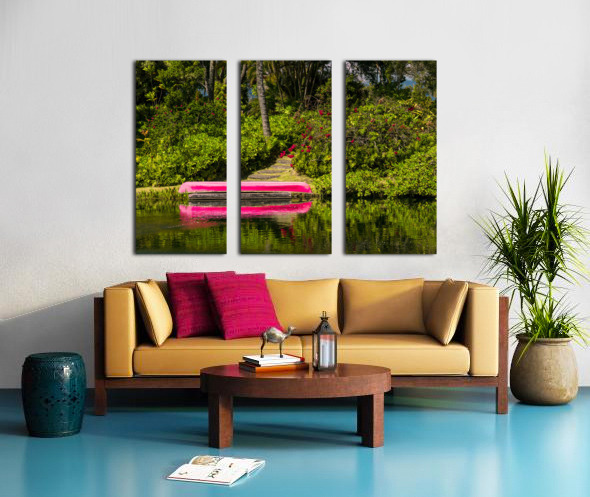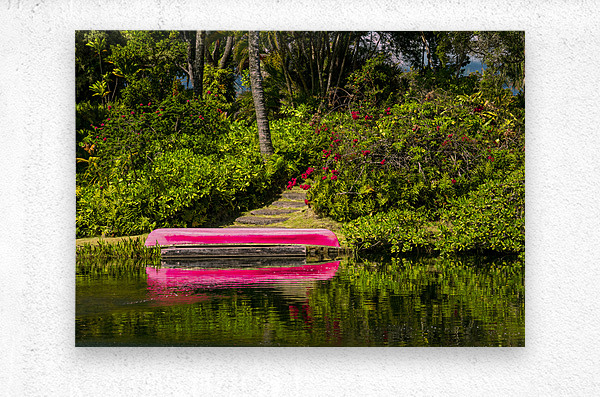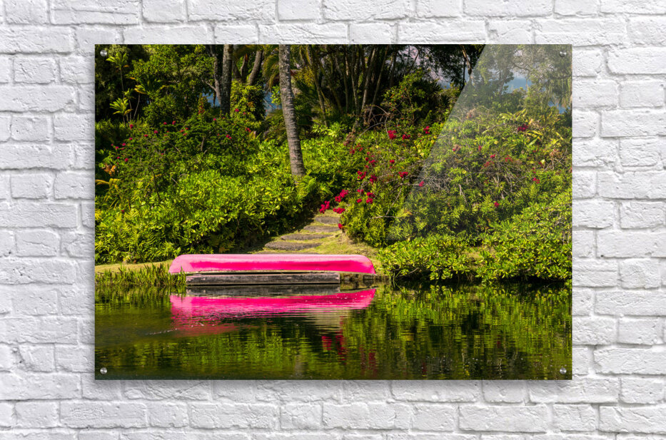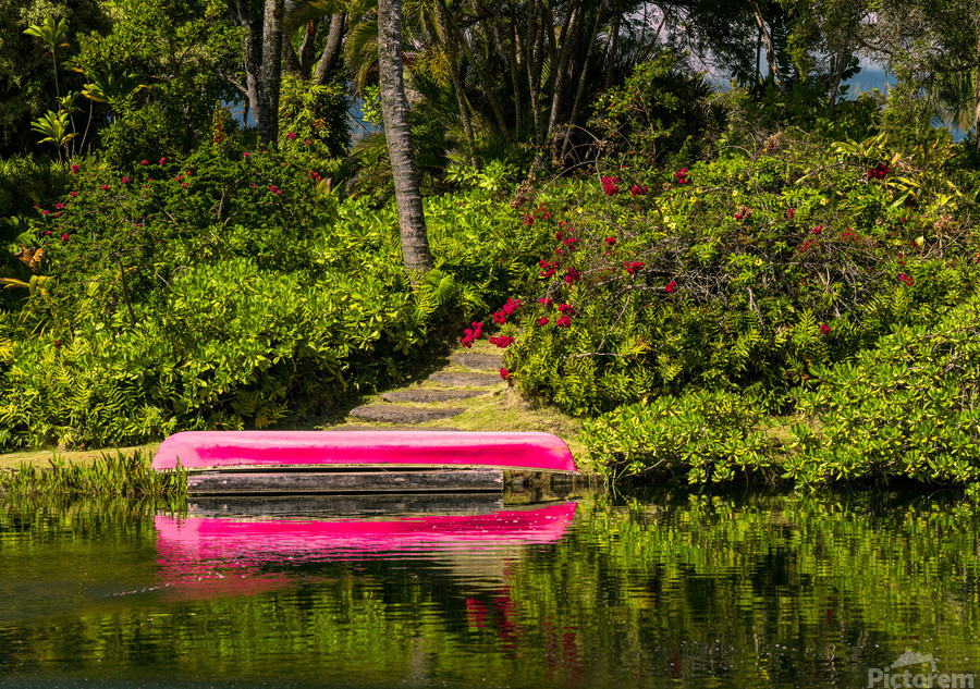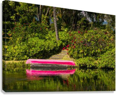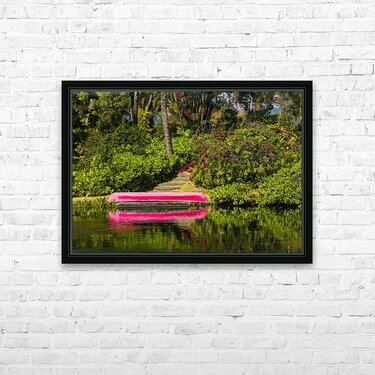Get this artwork "Red canoe on dock reflecting into calm lake or pond in garden" in a framed print.