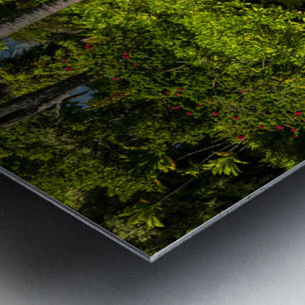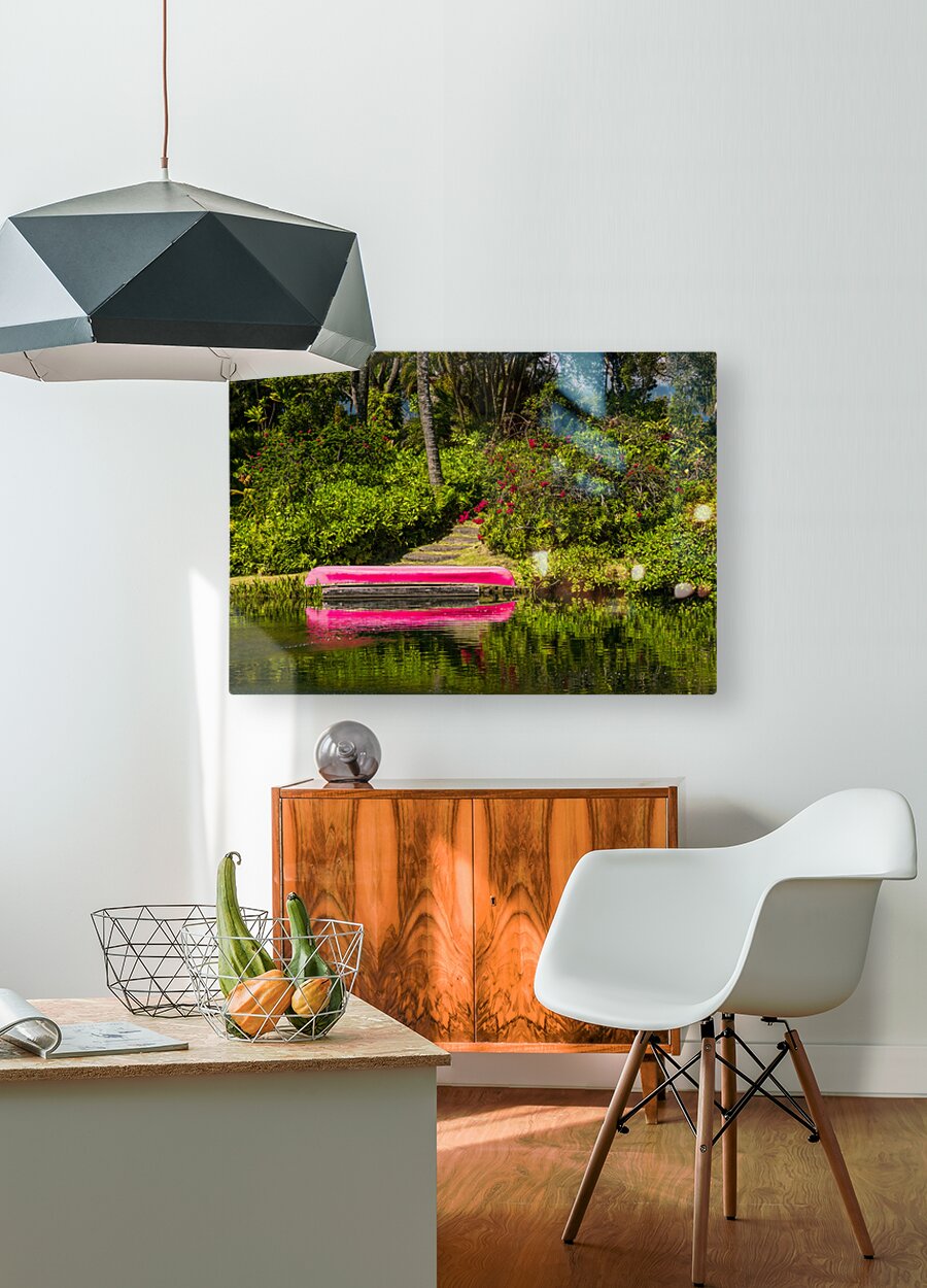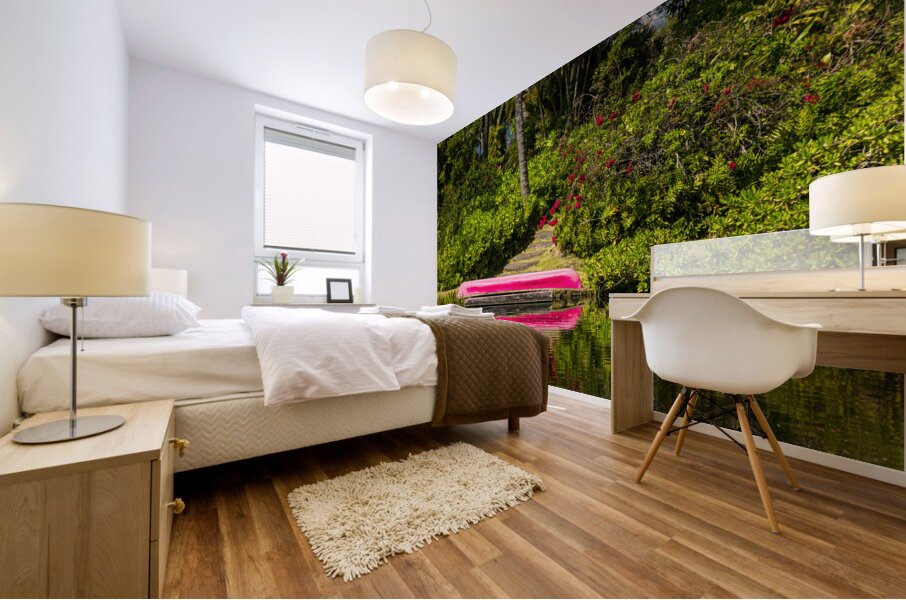 ABOUT THIS ARTWORK: RED CANOE ON DOCK REFLECTING INTO CALM LAKE OR POND IN GARDEN