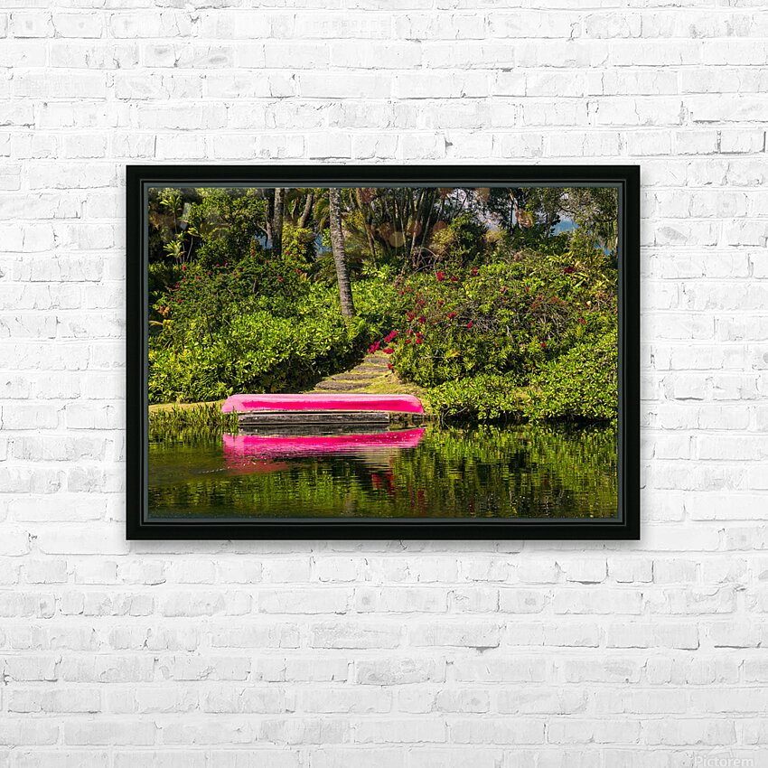 Red canoe on dock reflecting into calm lake or pond in garden Picture Frame Printing