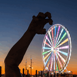 Two icons of National Harbor in Maryland near Washington DC are combined in this composition. The raised arm and hand of the Awakening is juxtaposed just above the illuminated Capital Wheel on the Potomac River. A slow shutter speed allows the lights on the Ferris Wheel to be slightly blurred to give it more prominence in the composition.