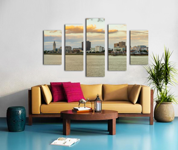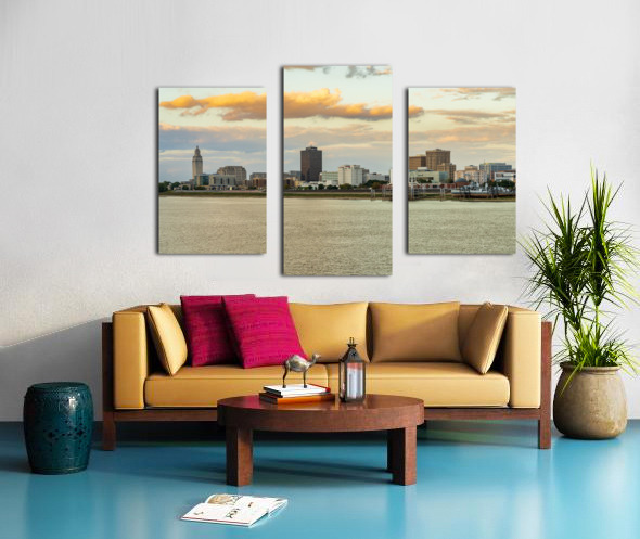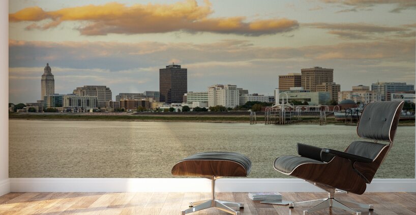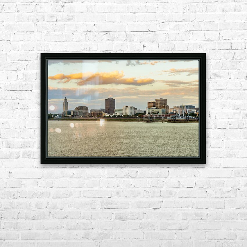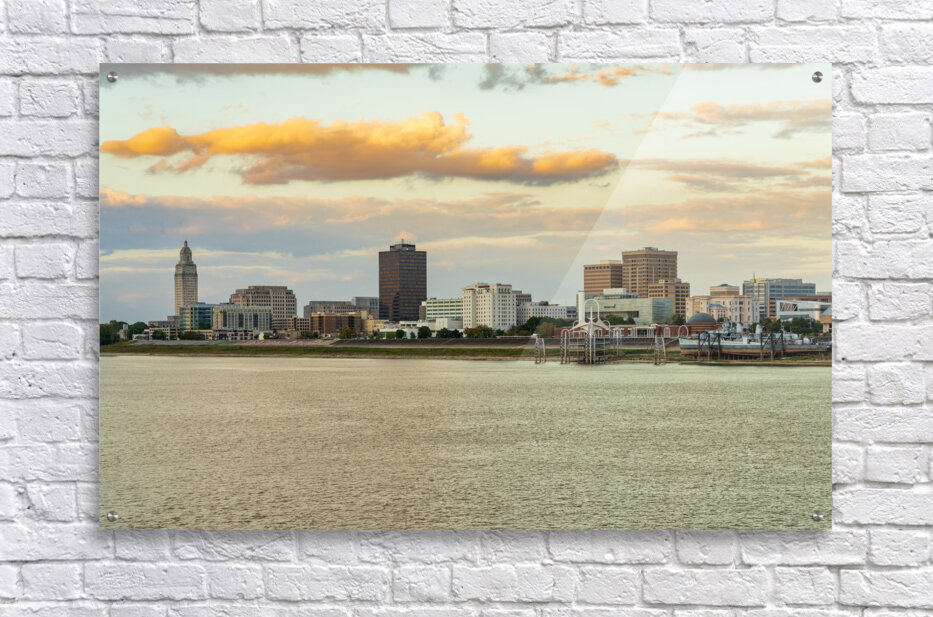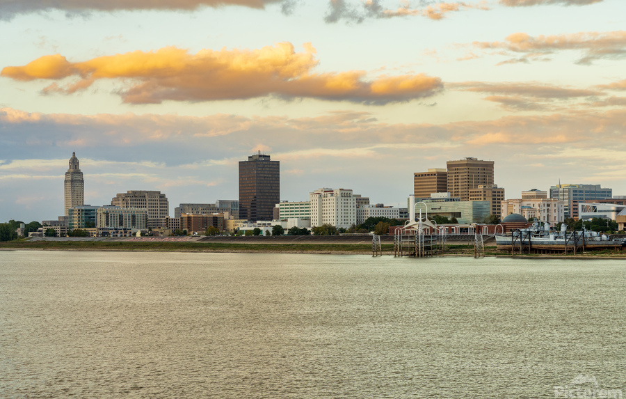 Get this artwork "Skyline of Baton Rouge at sunset over river barges" in a framed print.