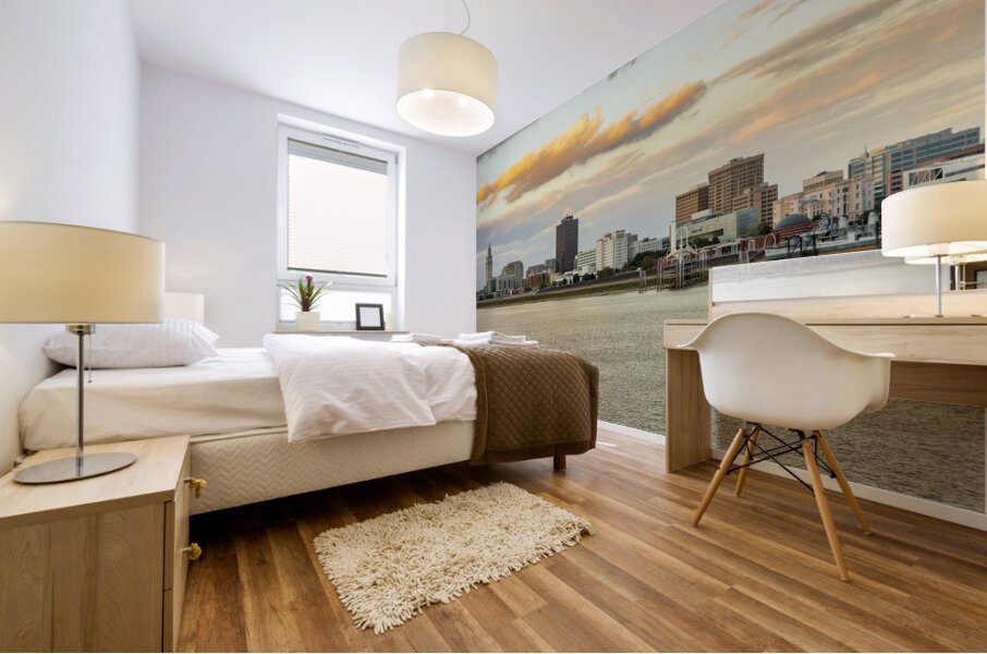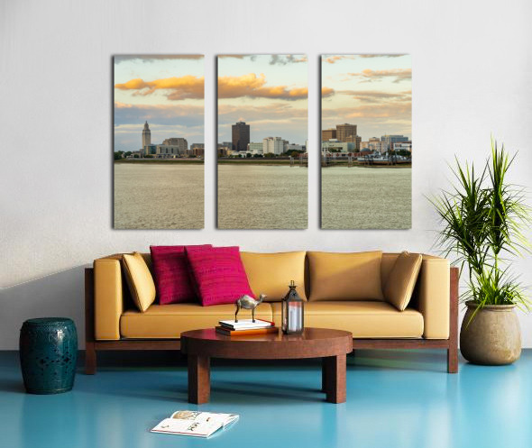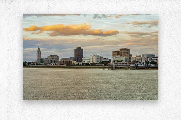 ABOUT THIS ARTWORK: SKYLINE OF BATON ROUGE AT SUNSET OVER RIVER BARGES