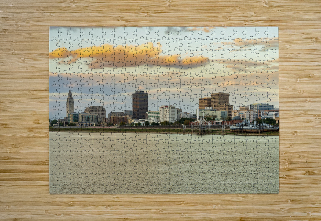 Skyline of Baton Rouge at sunset over river barges Steve Heap Puzzle