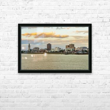 Skyline of Baton Rouge at sunset over river barges Picture Frame Printing