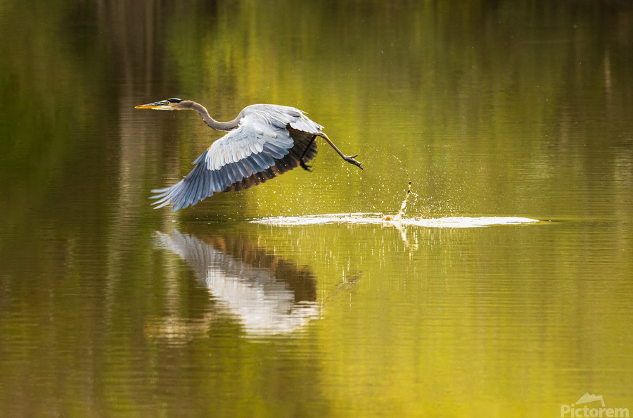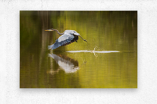 ABOUT THIS ARTWORK: GREAT BLUE HERON TAKING OFF FROM CALM WATER IN ATCHAFALAYA BASIN