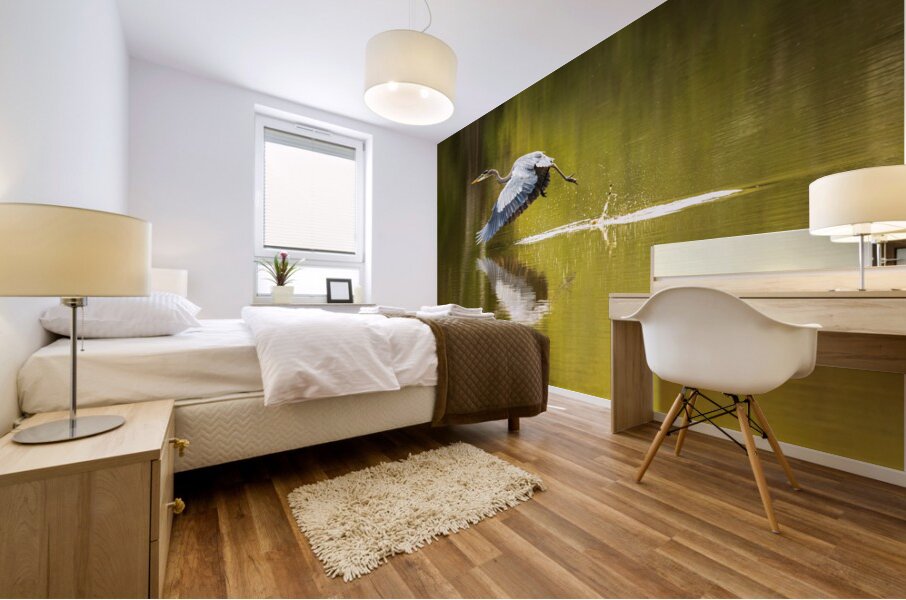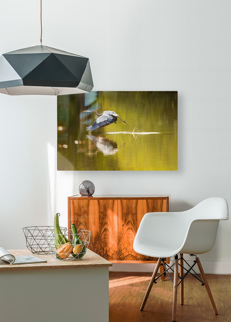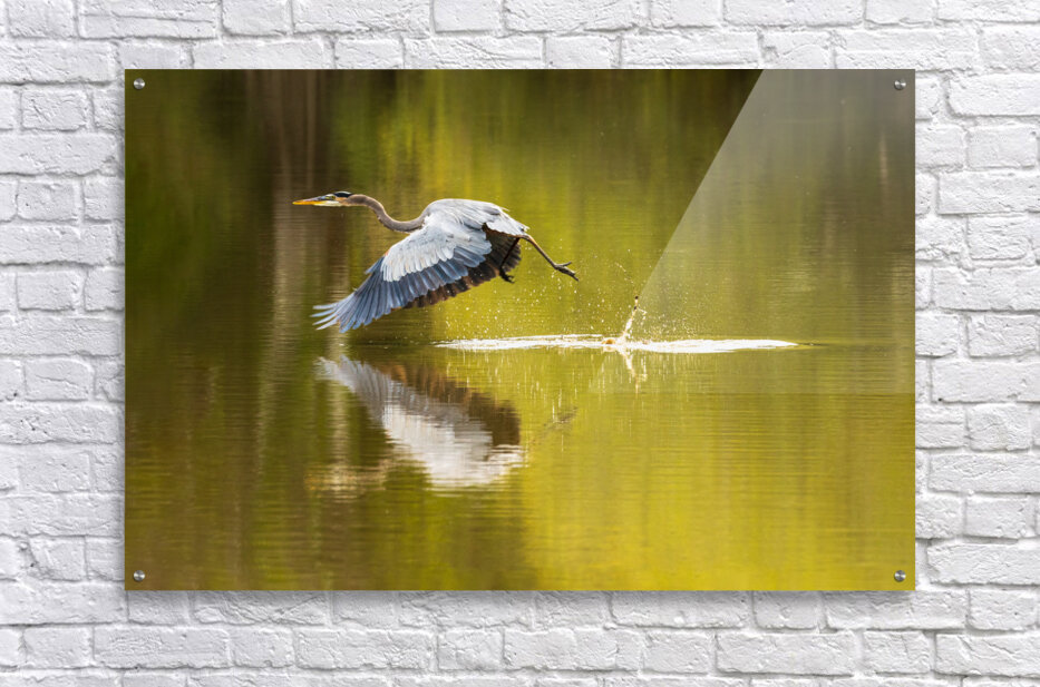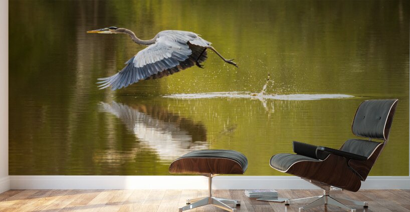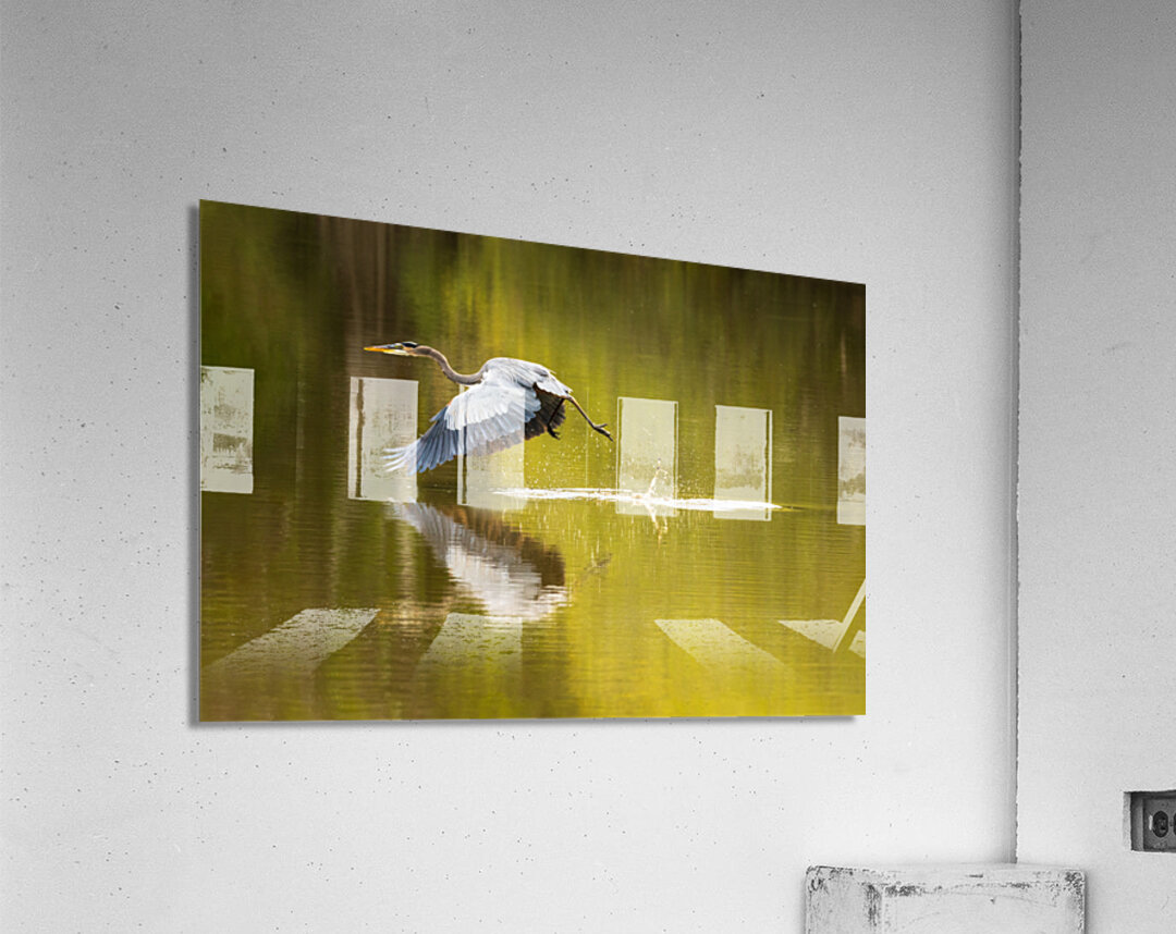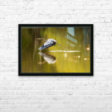 Get this artwork "Great blue heron taking off from calm water in Atchafalaya basin" in a framed print.