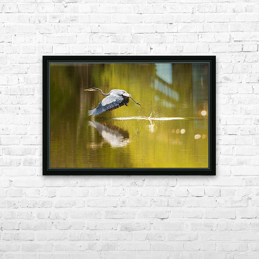 Great blue heron taking off from calm water in Atchafalaya basin Picture Frame Printing