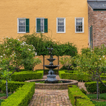 Small garden with brick paths and water fountain in French Quarter of New Orleans