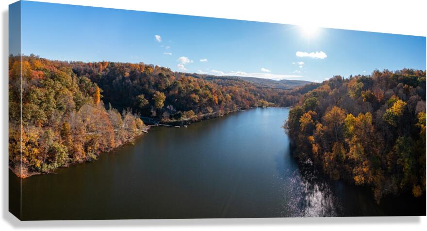Get this artwork "Panoramic fall trees around the water at Cheat Lake Park Morgan" in a framed print.