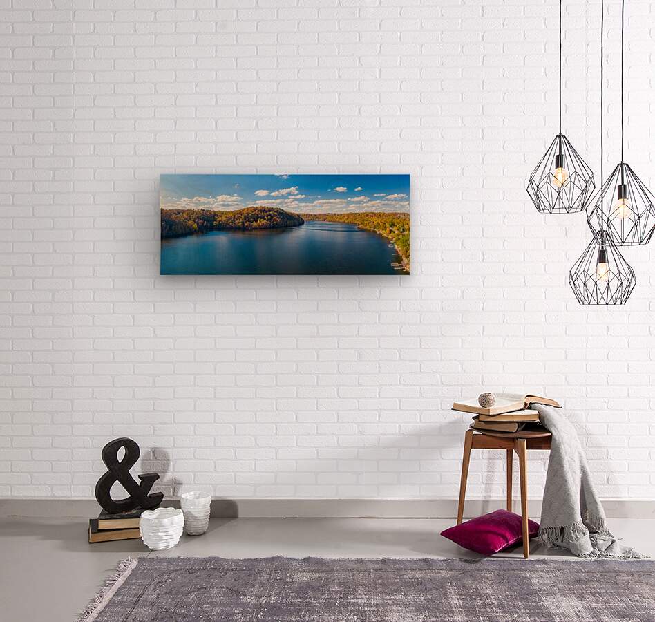 Aerial panorama of fall colors on Cheat Lake Morgantown WV with Wood print