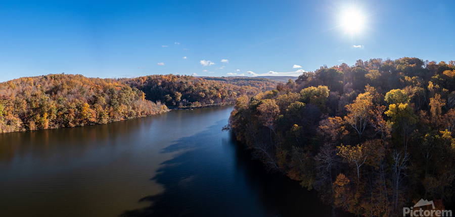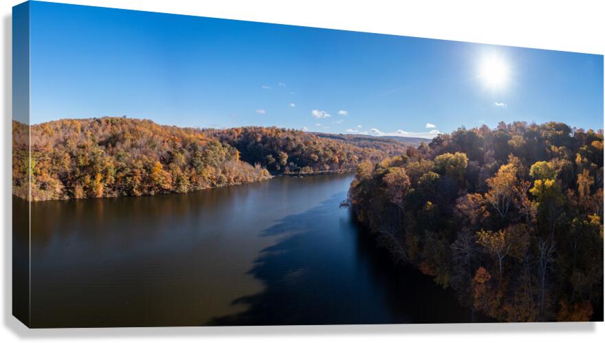 Get this artwork "Panoramic fall trees around the water at Cheat Lake Park Morgan" in a framed print.