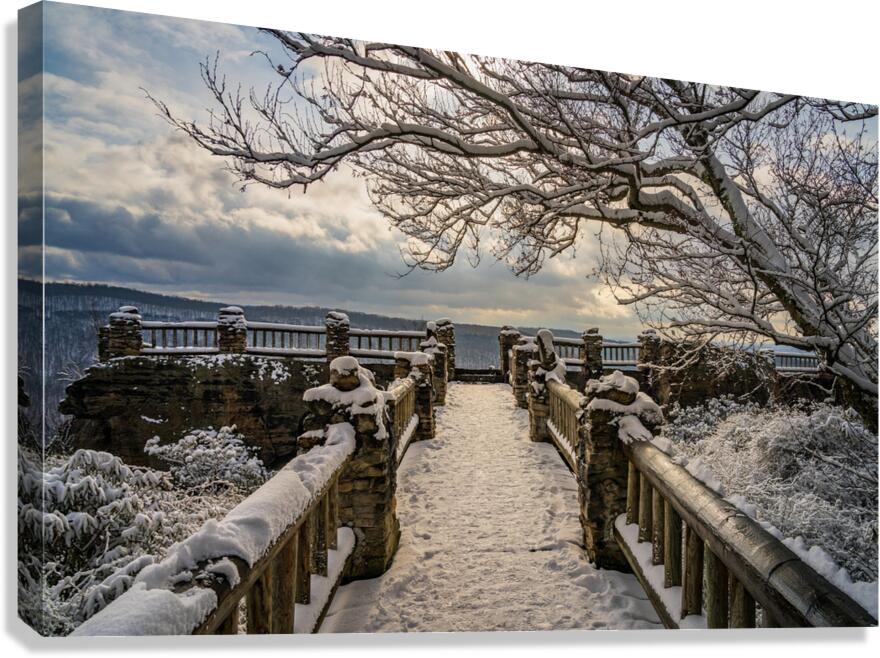 ABOUT THIS ARTWORK: COOPERS ROCK OVERLOOK ON SNOW-COVERED PATHWAY IN WV