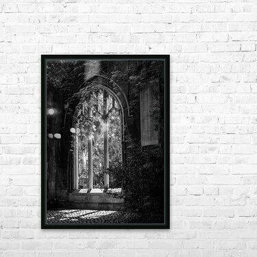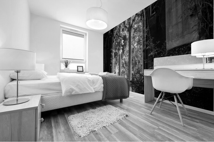 Carved stone windows of St Dunstan church in City of London covered with foliage in a black and white monochrome version