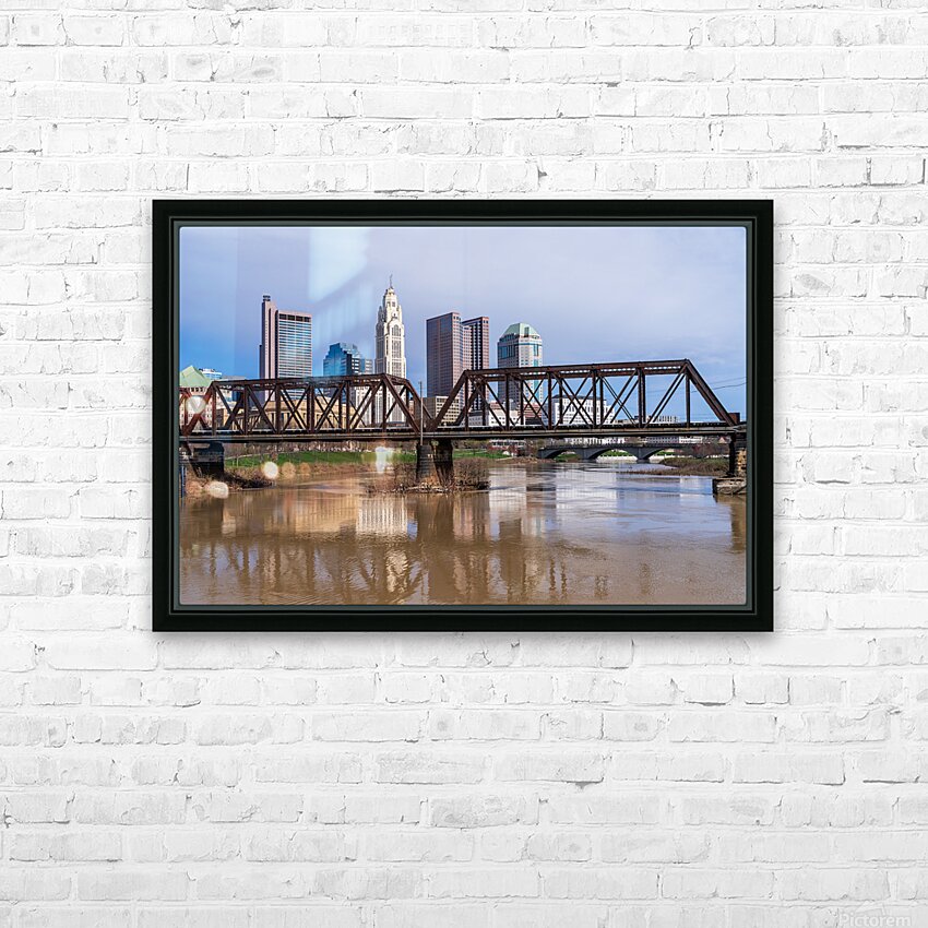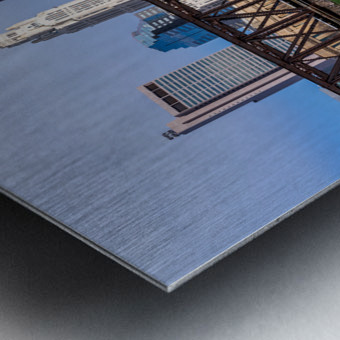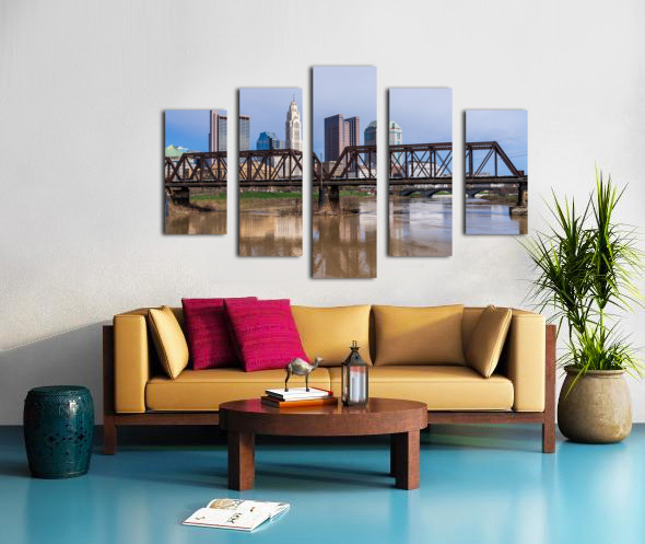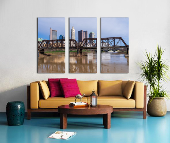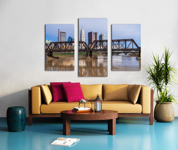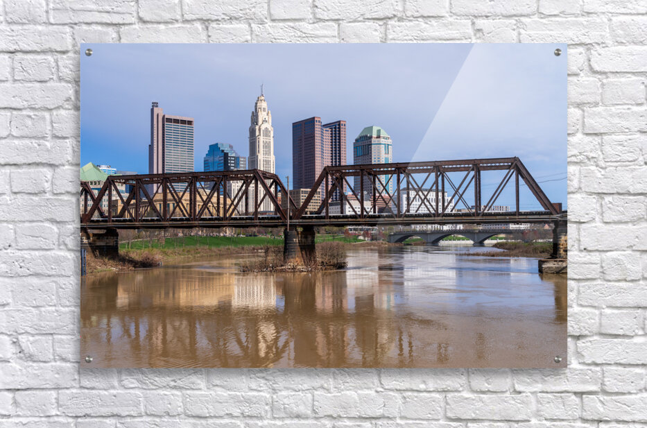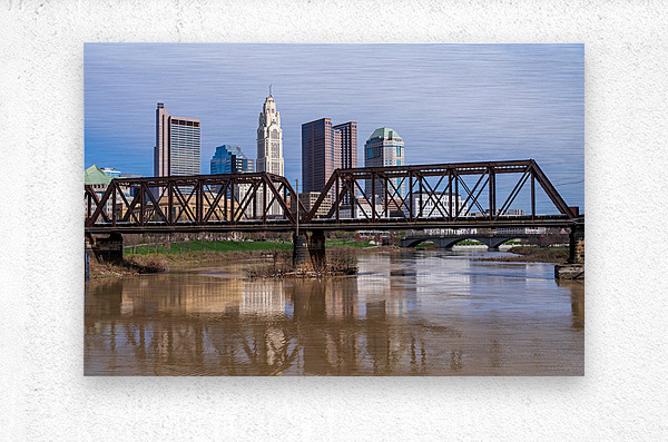 SUR CETTE OEUVRE: COLUMBUS OHIO WATERFRONT SKYLINE BEHIND RAILROAD TRUSS BRIDGE