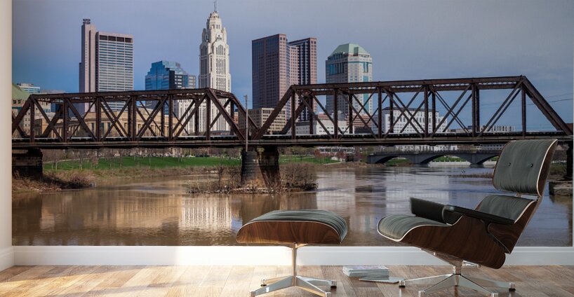 Columbus Ohio waterfront skyline behind railroad truss bridge Cadre photo
