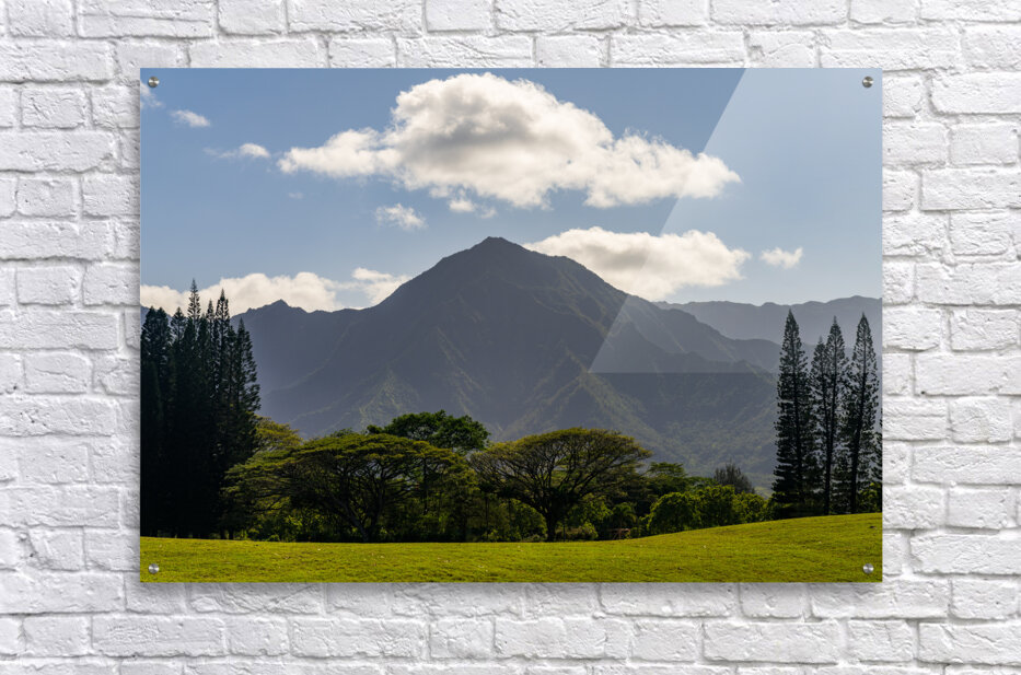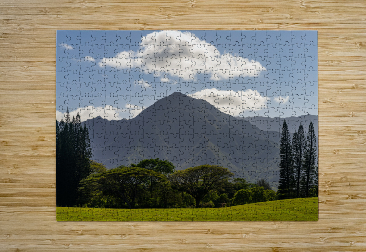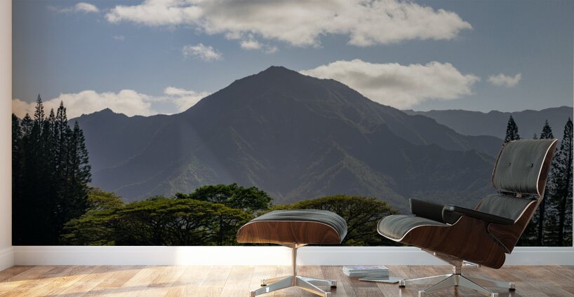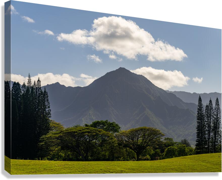 Cook pine trees line the golf course in Princeville with the Na Pali mountains of Kauai in the distance