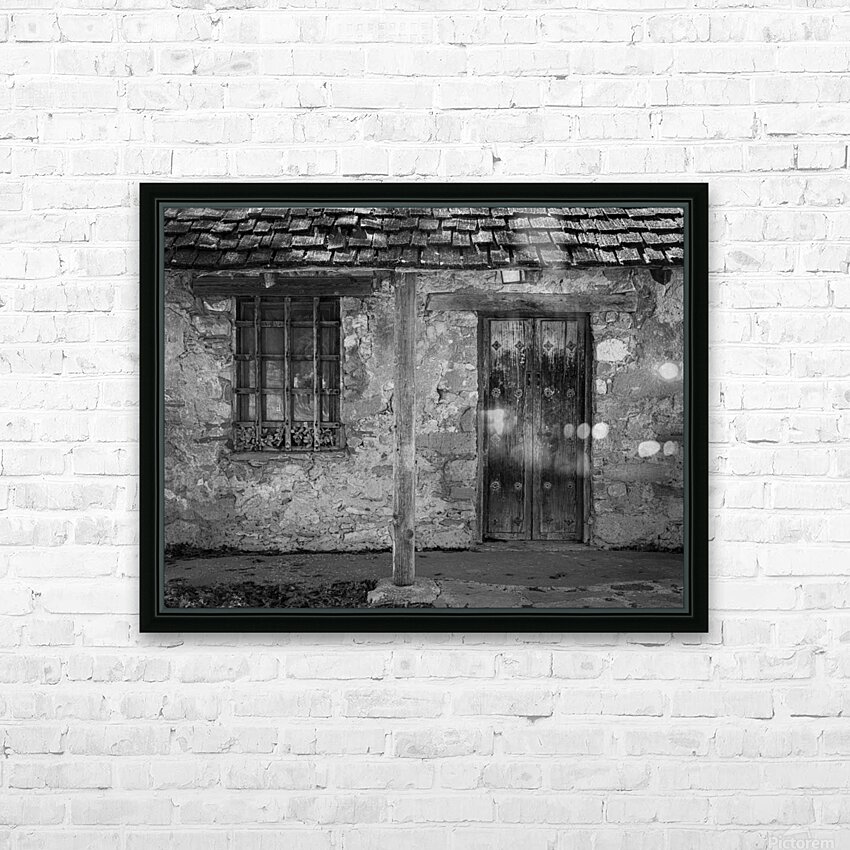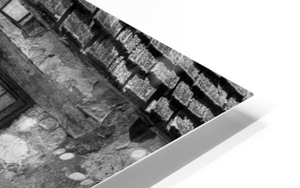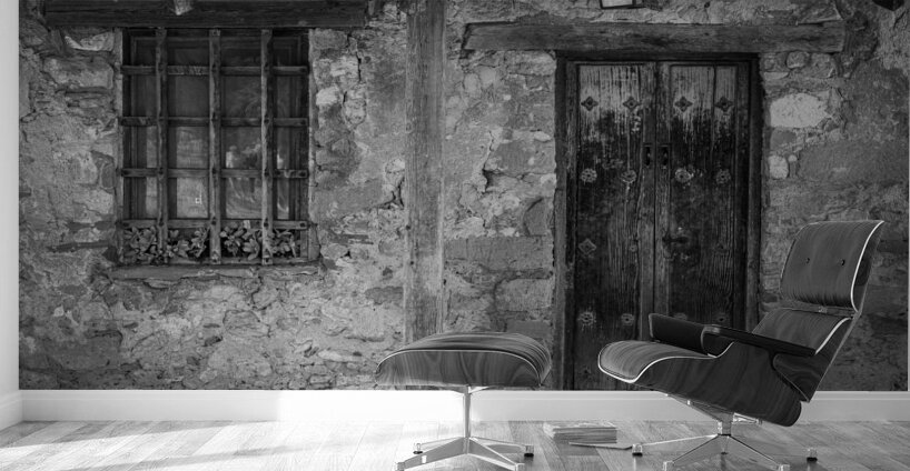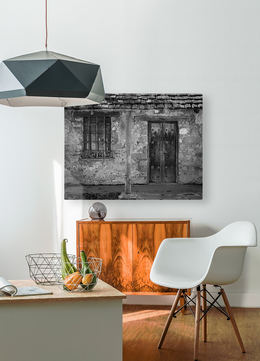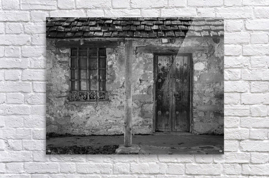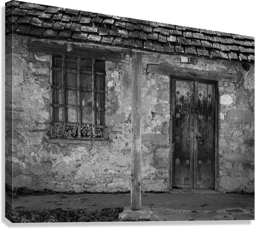 Monochrome treatment of old stone building with ancient wooden door housing workers in early days of San Juan Mission near San Antonio Texas