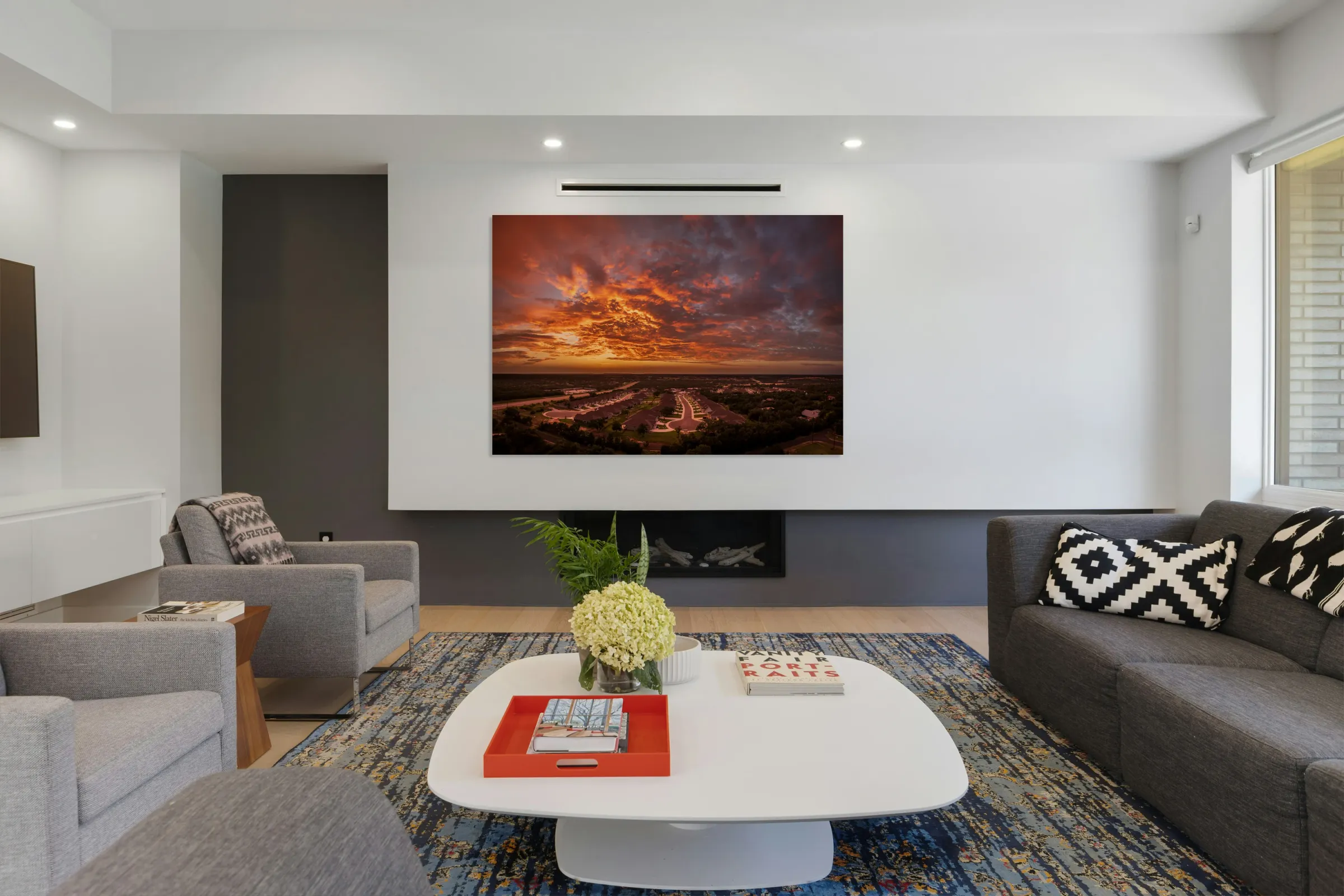 SUR CETTE OEUVRE: DRAMATIC SUNSET SEEN FROM DRONE OVER GEORGETOWN TEXAS RESIDENTIA