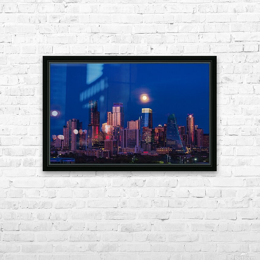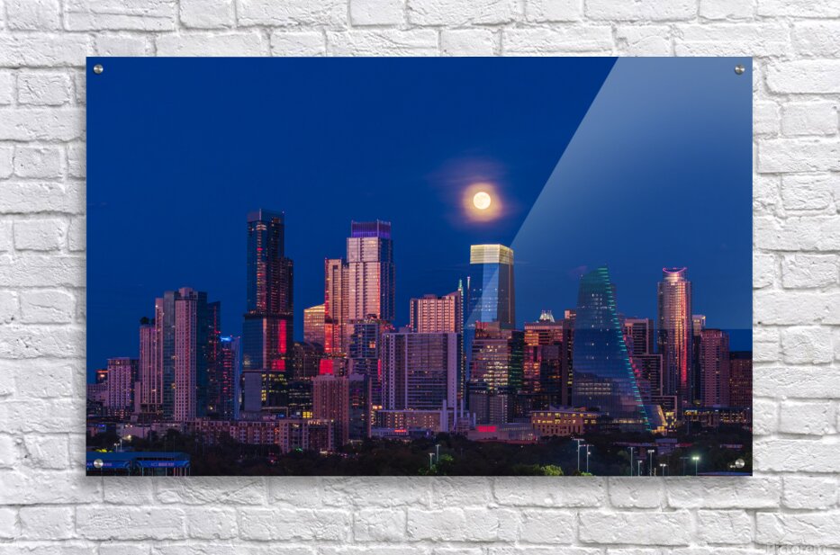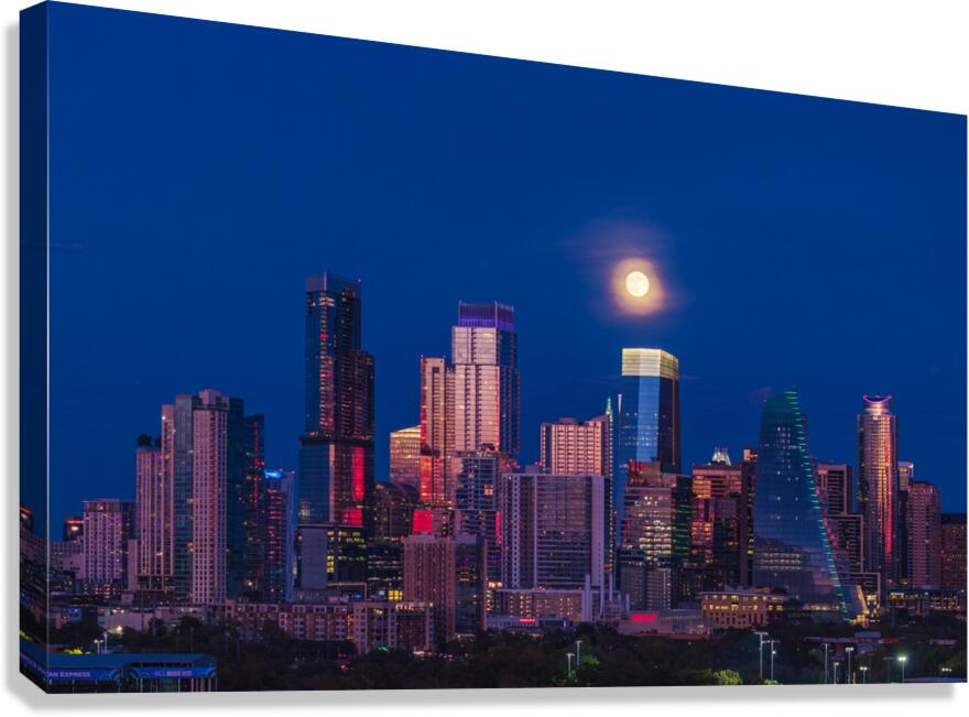 Exclusive fine art photography print ready to hang, capturing aerial view of the harvest moon rising above Austin Texas skyline as the full harvest moon is seen rising by the office buildings. Zilker Park in the foreground.