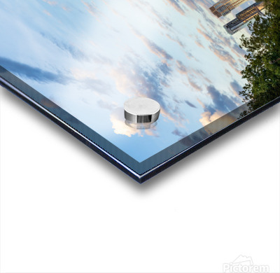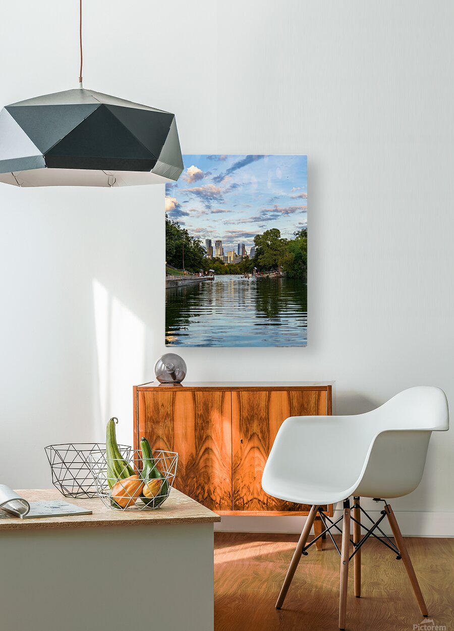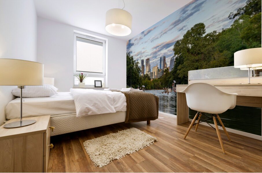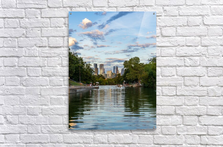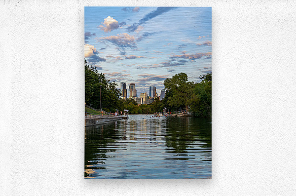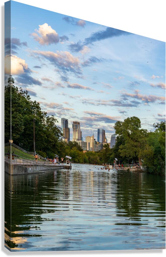SUR CETTE OEUVRE: VIEW OF THE AUSTIN SKYLINE AT SUNSET OVER BARTON SPRINGS SWIMMIN