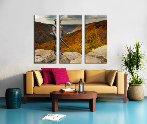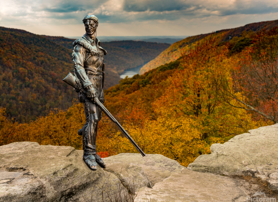 SUR CETTE OEUVRE: MOUNTAINEER STATUE FROM WVU WITH FALL LEAVES IN WEST VIRGINIA