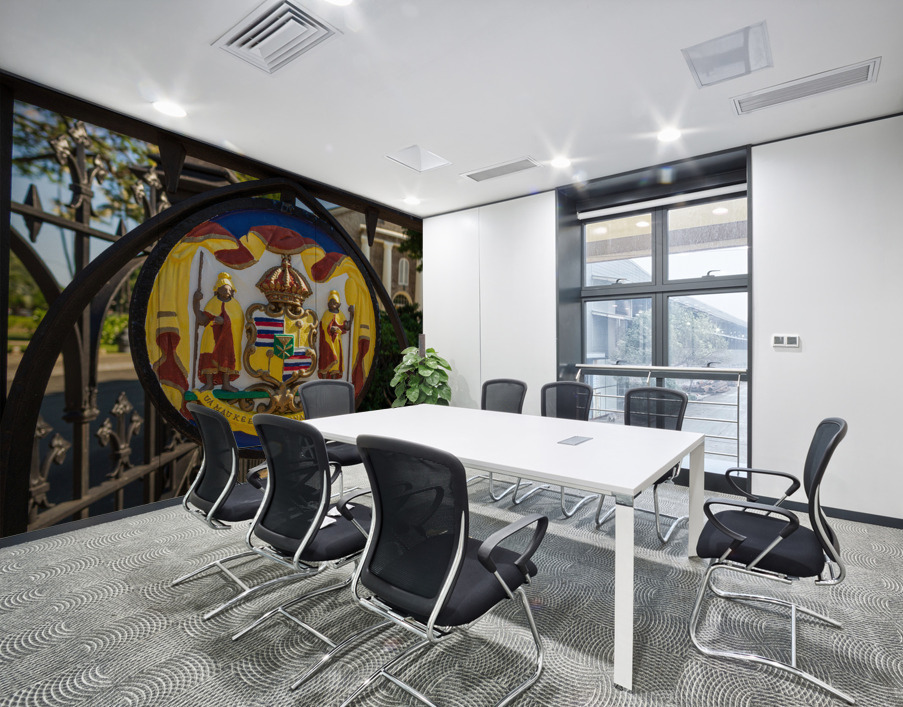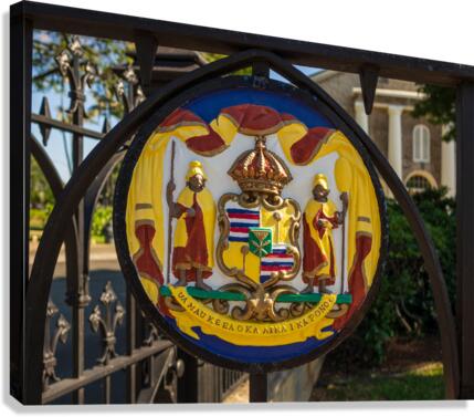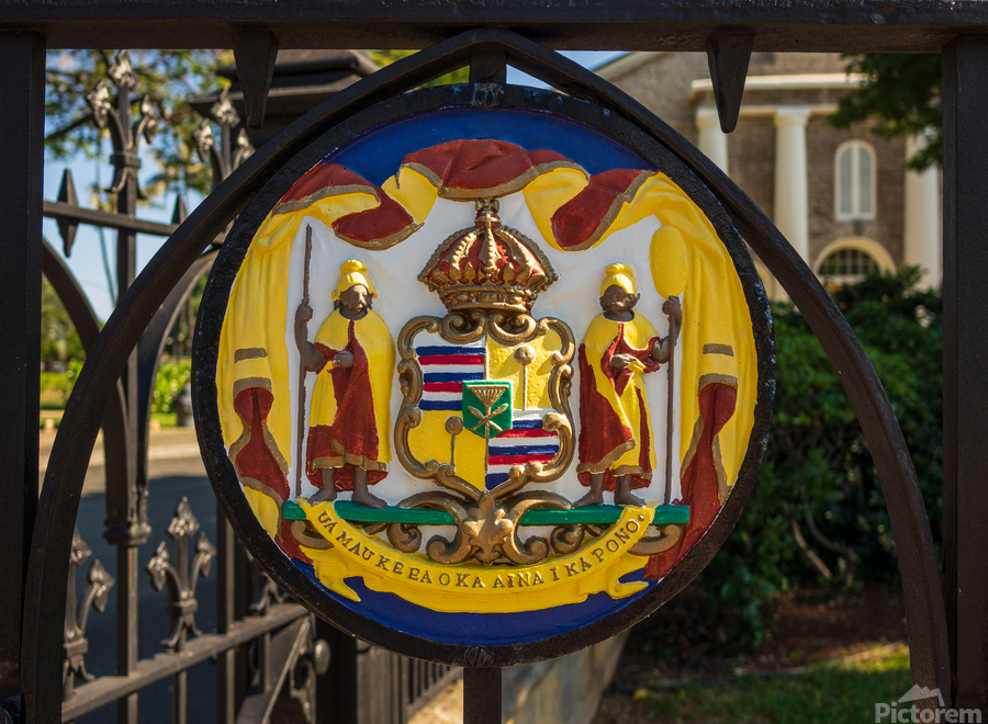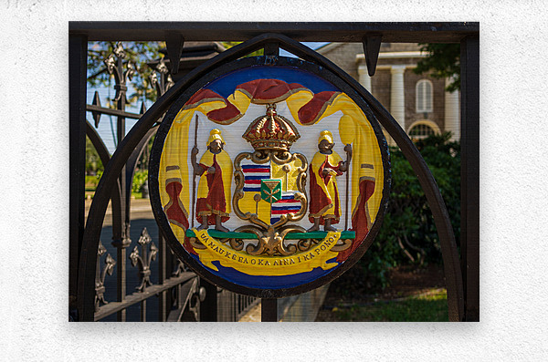 Painted Hawaiian royal seal on the cast iron fencing and gates at Kawaiahao Church in downtown Honolulu Oahu Hawaii