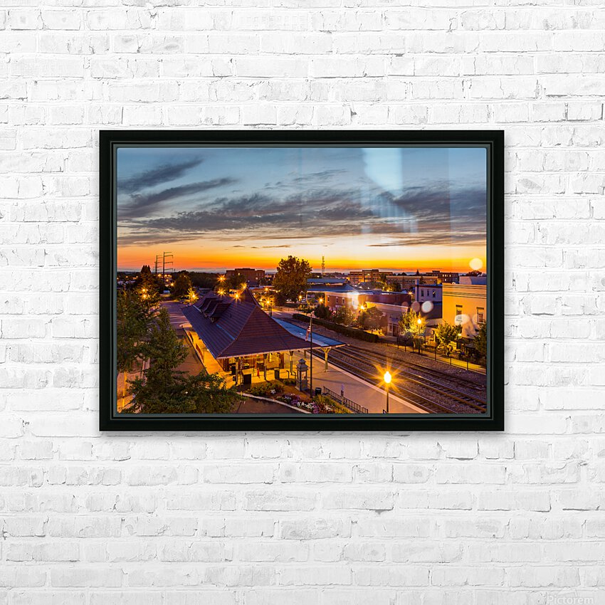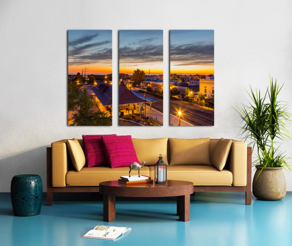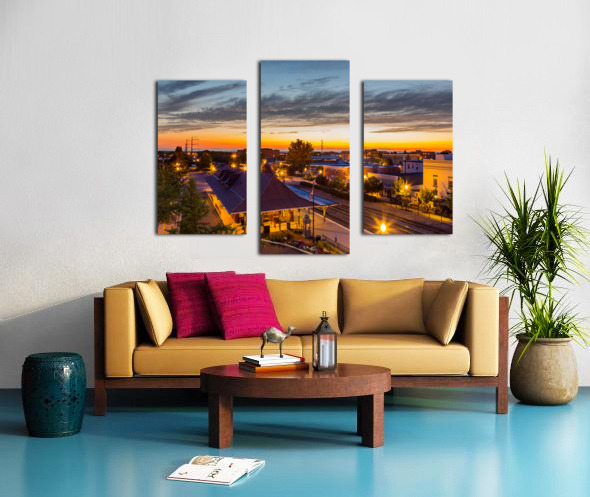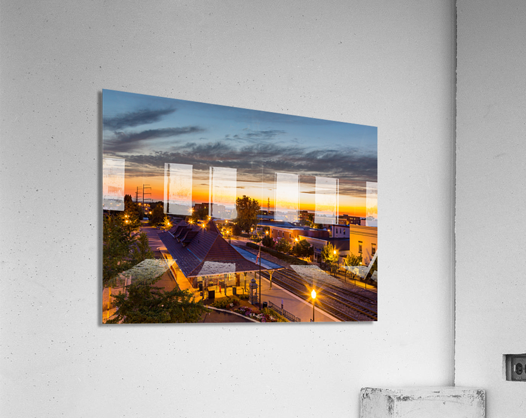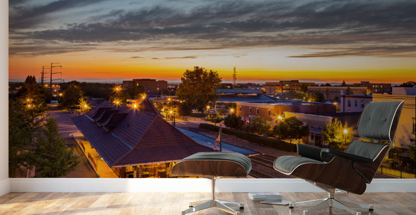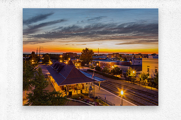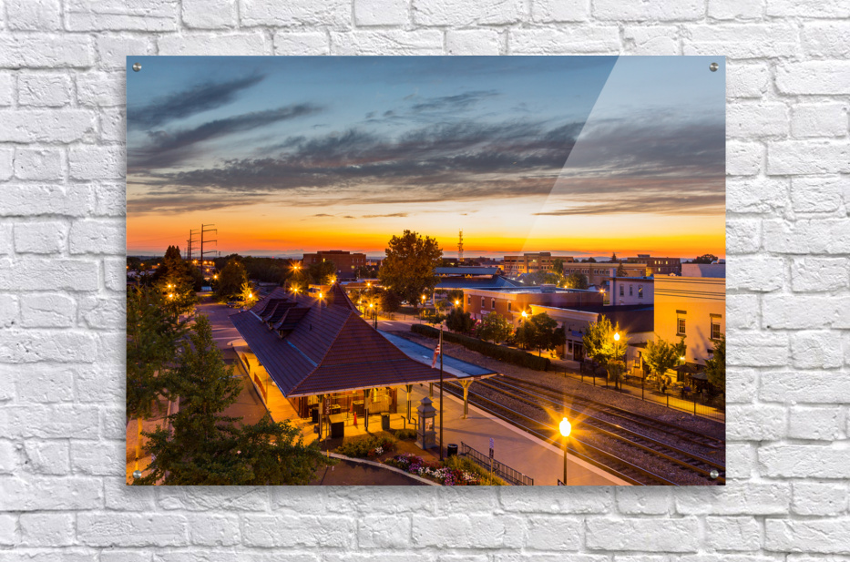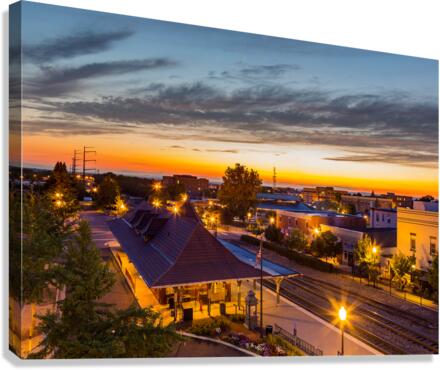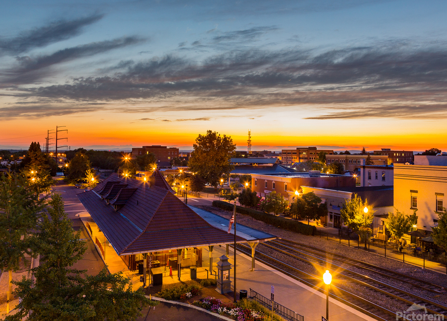Evening view of Manassas Railway station and town at sunset as the lights in the town come on