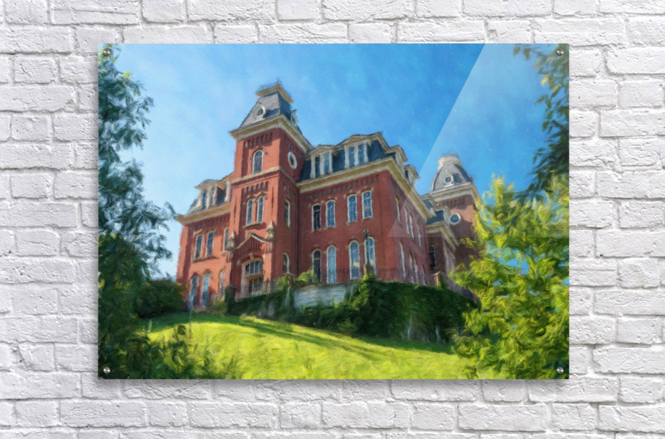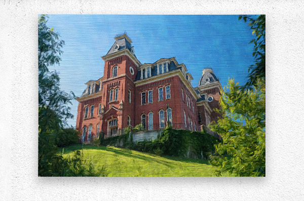 Impressionist painting of the historic Woodburn Hall at West Virginia University or WVU in Morgantown WV seen from below and looking up towards the rear and side of the building.
