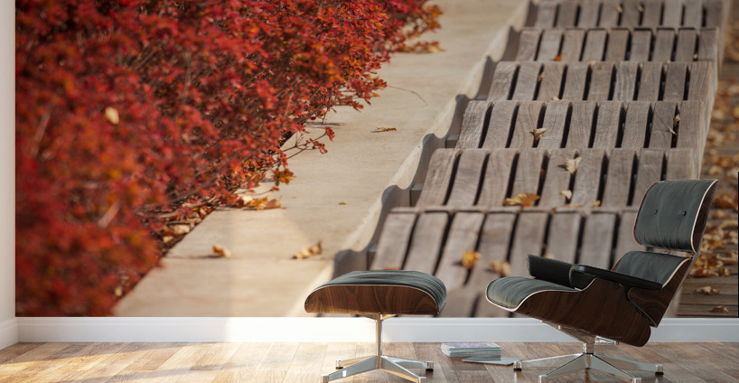 Modern wavy wooden seat or bench in Yards Park near Navy Yard along Anacostia riverfront in Washington DC USA on a lovely autumn day