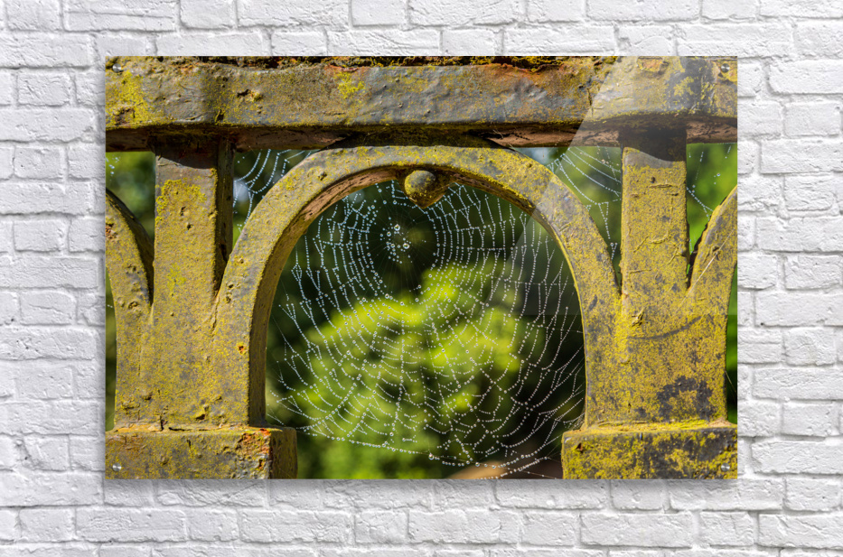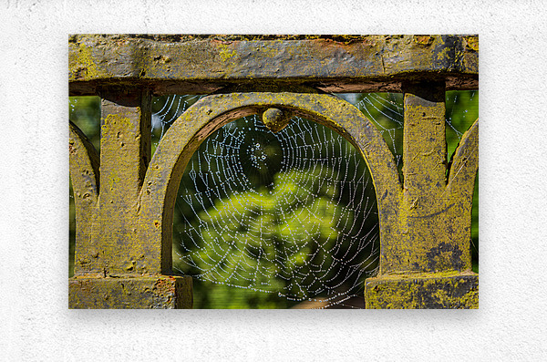 SUR CETTE OEUVRE: DEW GLISTENING COBWEB ON GATE