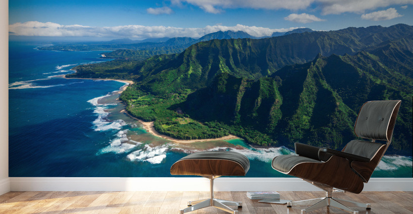 Aerial view of Kee beach and the coastline towards Hanalei on Hawaiian island of Kauai from helicopter flight