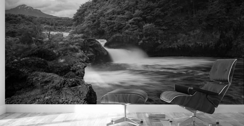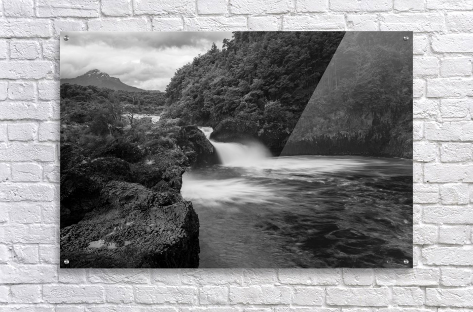 Clack and white view of river cascading down Petrohue Falls by the Osorno volcano in Chile