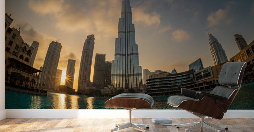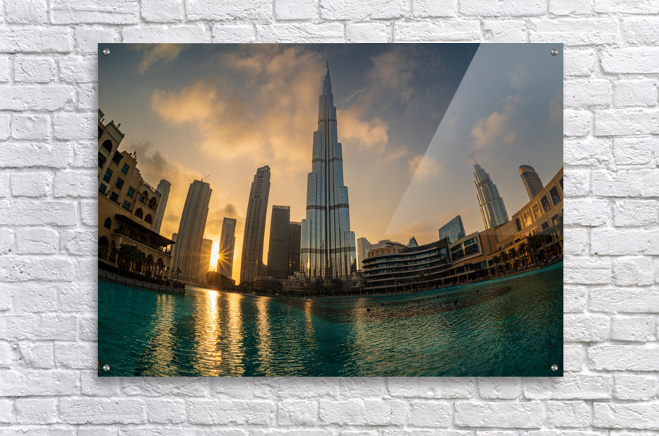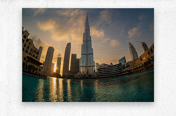 Extreme wide angle image of the Burj Al Khalifa tower at sunset and sunburst over skyline of Dubai downtown business district by Burj Khalifa lake