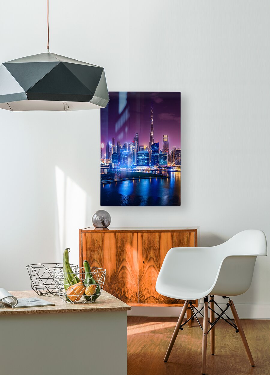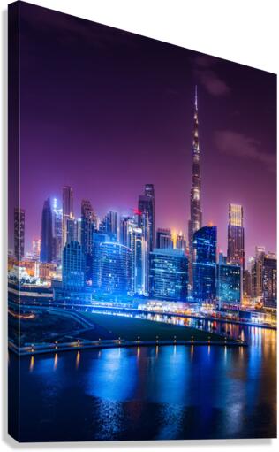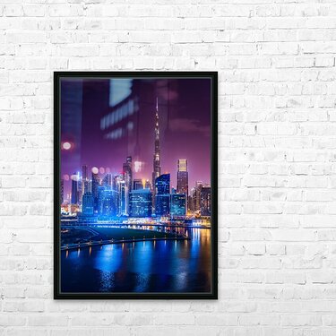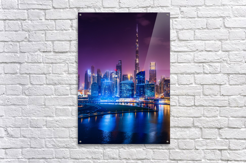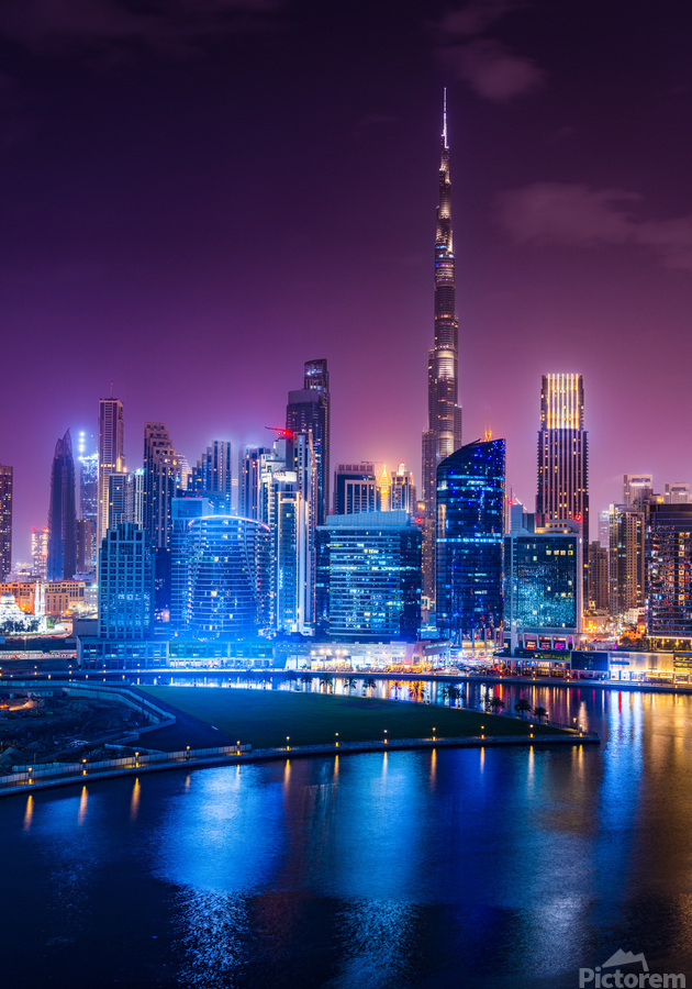 Night view of the illuminated skyline of the downtown district of Dubai from apartment in Business Bay. This photo captures the stunning view of Dubai's Business Bay district at night with its towering skyscrapers and modern architecture. The district is known for its vibrant nightlife with several upscale nightclubs and smaller venues where you can get waterfront views. Downtown Dubai has some of the city's hottest nightlife venues, with new spots coming online all the time. The photograph is perfect for those who love modern architecture and want to add a touch of sophistication to their living space. It can be purchased as wall art, home decor, apparel, phone cases, greeting cards, and more on pictorem.com.