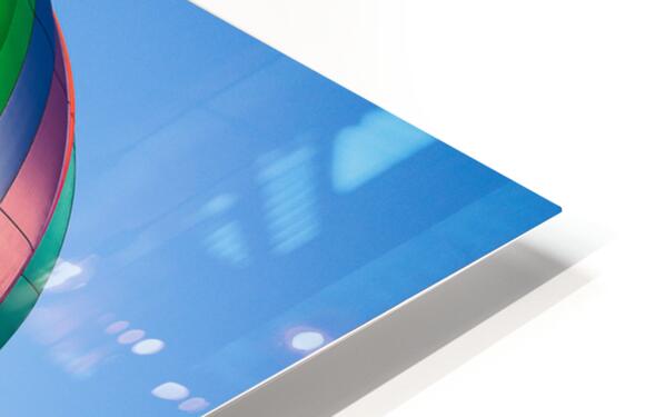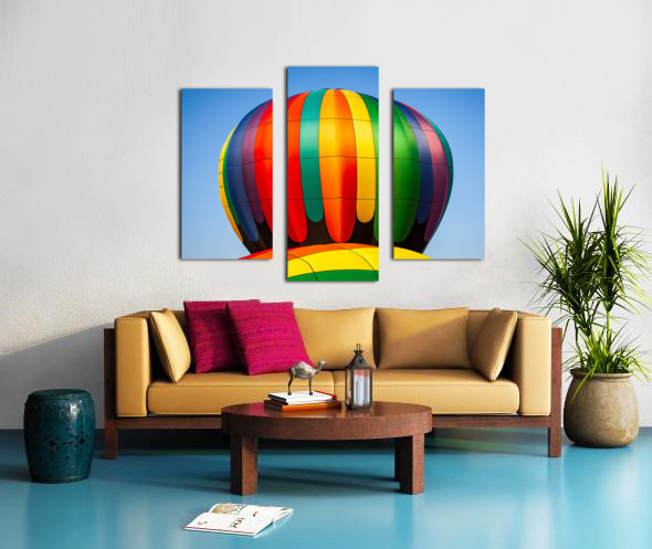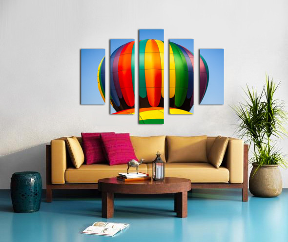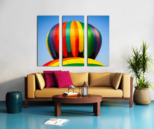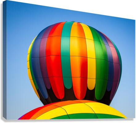 SUR CETTE OEUVRE: COLORFUL HOT AIR BALLOON RISING ABOVE ANOTHER WITH BLUE SKY