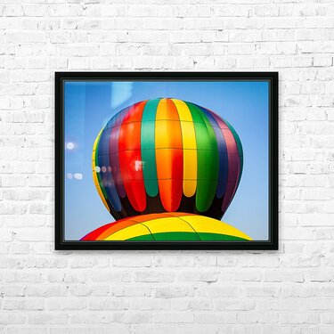 Pour obtenir "Colorful hot air balloon rising above another with blue sky" dans une impression encadrée.