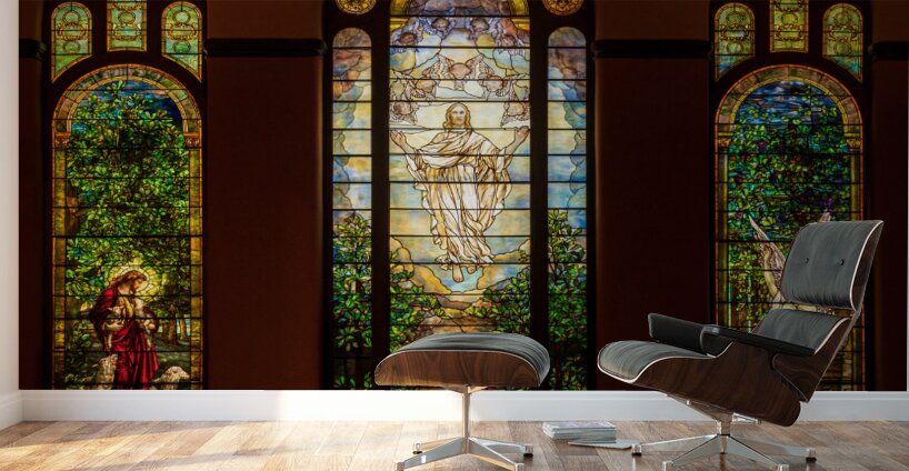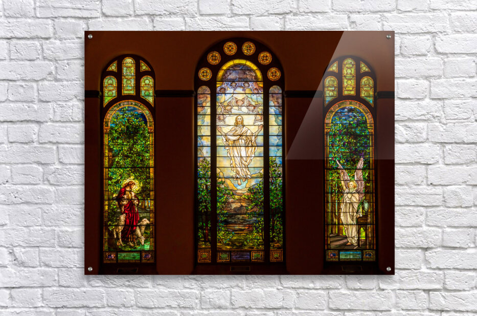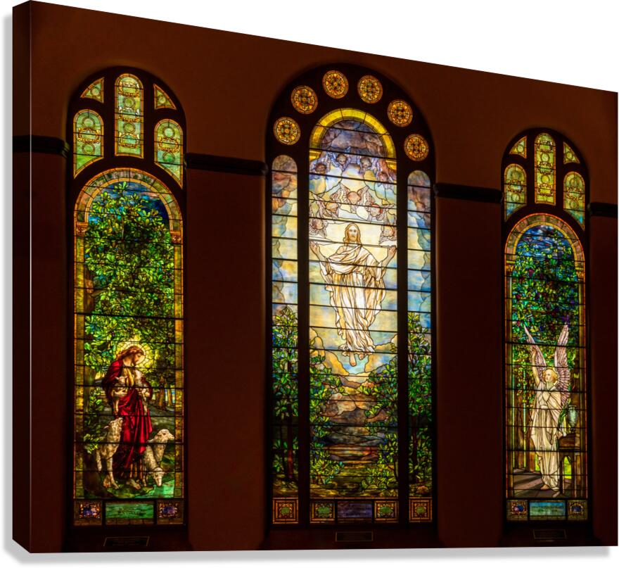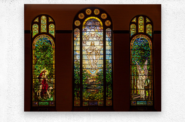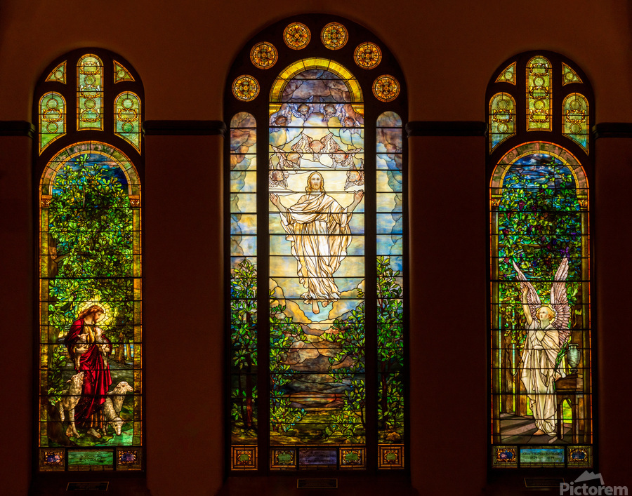 Antique priceless Louis Tiffany stained glass windows in the St Luke Methodist church in Dubuque Iowa. Installed from 1896 they were among the first to have colour placed in the glass rather than painted on the surface. These windows show the Ascension of Christ The Angel of Victory and The Good Shepherd. This latter window is considered to be Tiffanys finest production in glass. The crown of thorns and the glow on Jesus face is remarkable. The winged angel announcing the Resurrection included purple grapes. The center window is the Ascension of Christ and it shows Jesus in robes of pearl surrounded by cherubic faces that flash like opals.