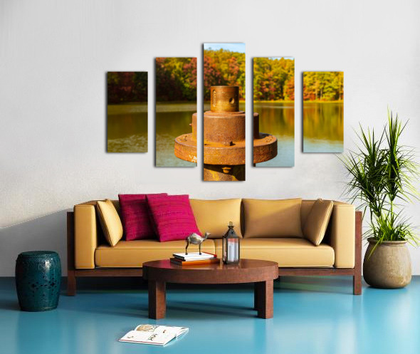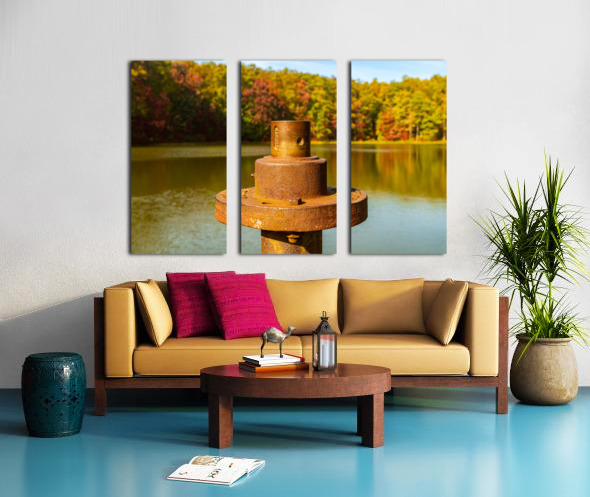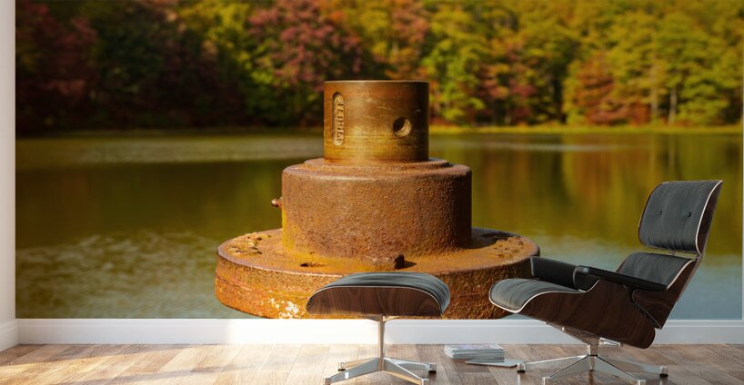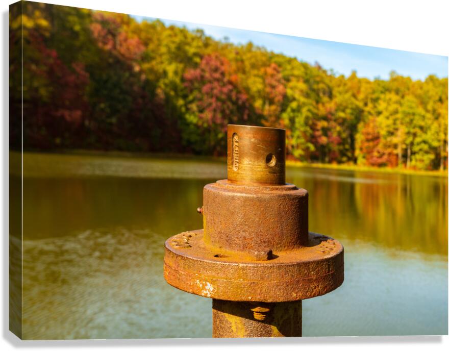 Close view of the rusty metal pipe and valve on a pier in calm reservoir in Coopers Rock State Forest near Morgantown WV as the fall leaves provide the background