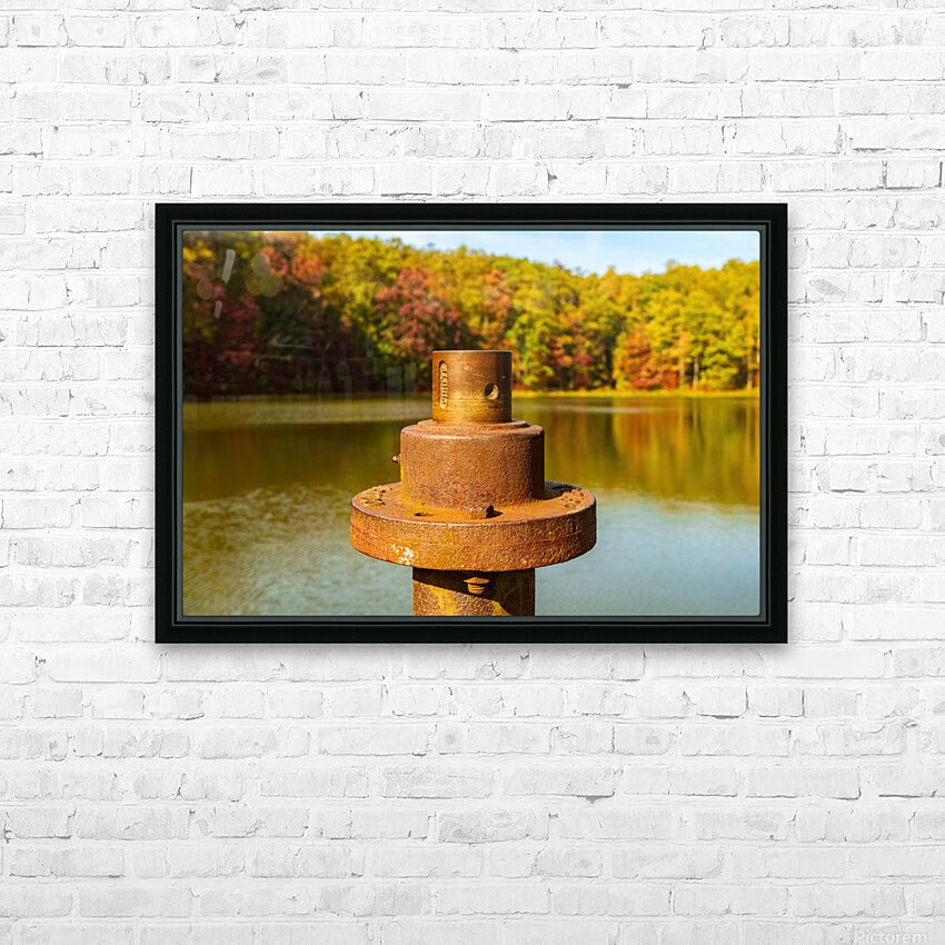 Close view of the rusty metal pipe and valve on a pier in calm reservoir in Coopers Rock State Forest near Morgantown WV as the fall leaves provide th...[+]