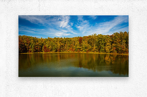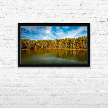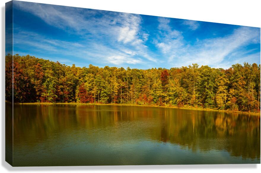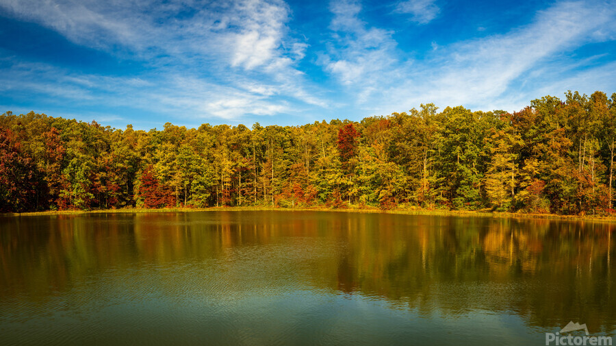 SUR CETTE OEUVRE: FALL LEAVES SURROUND RESERVOIR IN COOPERS ROCK STATE FOREST IN W