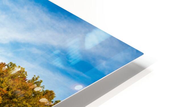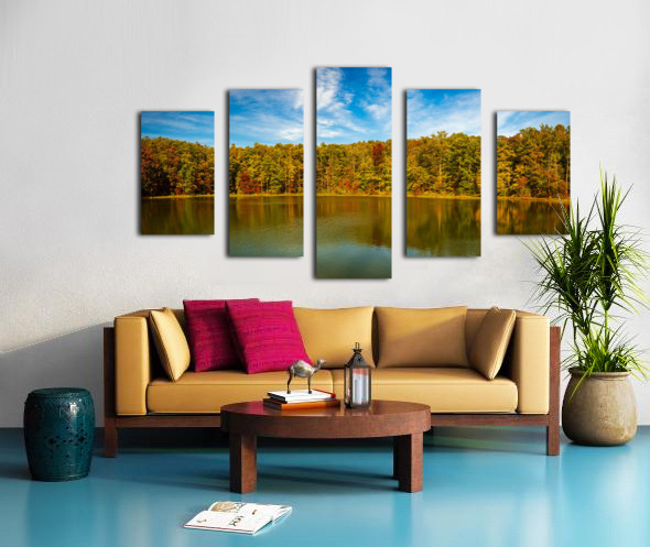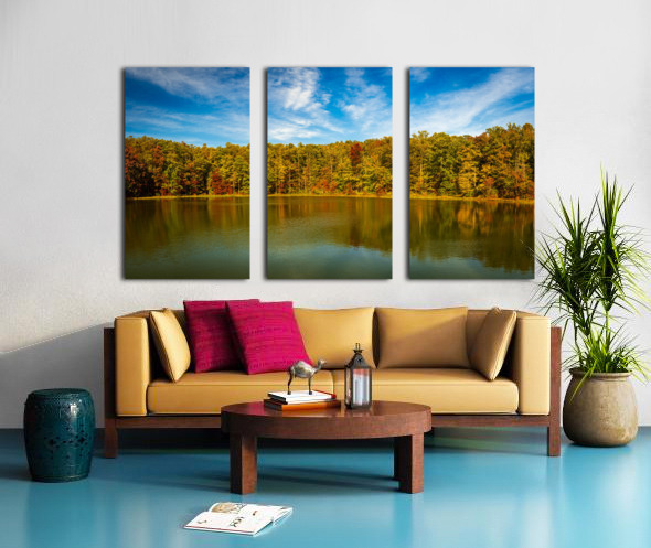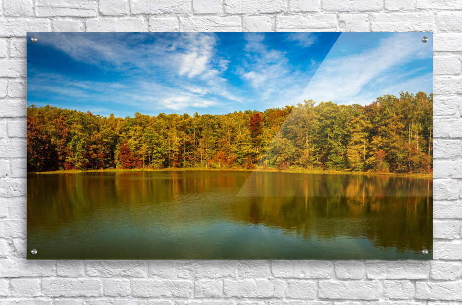 Fall leaves surround reservoir in Coopers Rock State Forest in W Impression sur bois