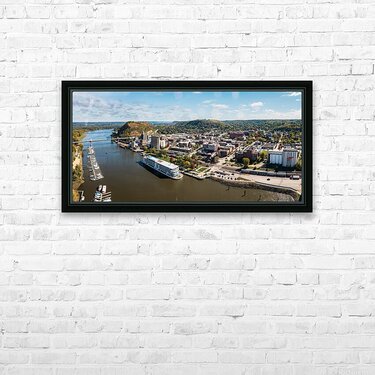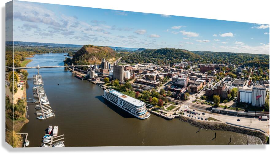 Pour obtenir "Aerial view of Red Wing Minnesota with river cruise boat" dans une impression encadrée.