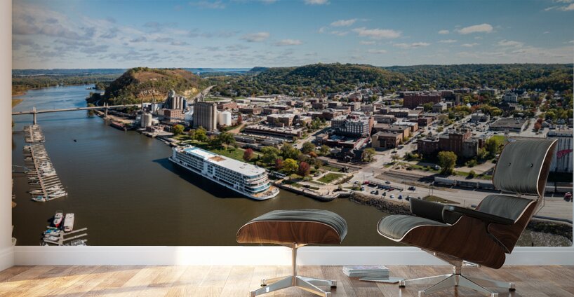 Red Wing MN - 15 October 2023: Panoramic aerial view of the town in Minnesota with Viking Mississippi docked